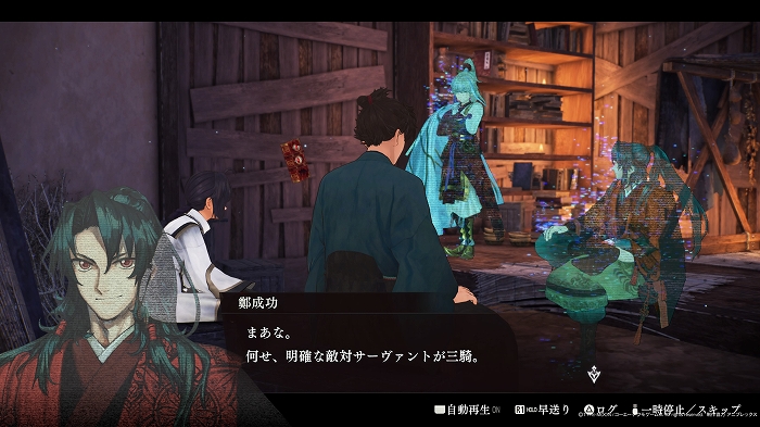 横須賀での戦いから翌日、鄭達と状況確認を始めます。現在の戦況は大雑把に言うと、セイバー&アーチャー&バーサーカー対アサシン&ライダー&ランサーって感じになってますね。キャスターだけは出てきてないのですよね……。蛇毒から復帰したばかりの伊織は敵の情報探索からはずれるように鄭から言われたので、ゆっくり休養を……せずに剣の稽古へ向かいます。そりゃカヤちゃんも心配するよ。しかし伊織はセイバーの宝具を見た時の感覚を忘れないうちに行動したいようです。向き合うのは己自身だ! 相手の行動はもちろんそれぞれの型を使った動きをしてきます。そこで4つ目の型、火の型に目覚める伊織。体力が低いほど攻撃速度威力があがる型です。瀕死状態で使うとかなり強い! スキルに小型の傀異なら通常攻撃で怯ませられる、というものがあるのでかなり使い勝手がよさそうです。稽古を終え自宅に戻ると……、あぁ! また自宅がめちゃめちゃにされてる!! 地右衛門とランサーが表れ、どういう目的かカヤを攫っていきました。これはカヤの正体に気づいての行動か……?地右衛門達が去った後に武蔵と鄭が合流。カヤの捜索に加わってくれました。霊地争奪戦開始。目指すは地右衛門の本拠地と思われる小石川です。上野にタマモアリアがいるのでまずはそこまで進めて補助をもらいたいですね。瀕死の状態で使う火の型マジで強い。強敵の体力がガンガン削れてくのでこればっかり使いそう。霊地争奪戦もコツをつかめてきたので全マス制覇だってしちゃう。背後の霊地をとって霊脈を断てば消滅するので敵をわざと侵攻させるのも手なのですよね。そういう行動すると紅玉の書が慌てる声だすからびっくりしてしまう。到着した小石川はボロボロに朽ちた建物ばかりで人が住むような場所には見えません。途中で罠があったり傀異が出現したりするも、地右衛門やカヤの居場所のヒントとなるようなものは見つかりませんでした。一体どこへ行ってしまったのか……。御徒町で何か起こってるようなので向かうと、何故か徘徊してる陰陽師。蹴散らして進むと、ぬ!! お前キャスターだろ!! おそらくキャスターと思われる人が陰陽師と話していました。何か仕掛けを施しているようですが紅玉の書にも何もわからないようです。キャスター(仮)は去り陰陽師が敵を召喚してきた。名前と見た目が変わってるが普通の鎧武者と変わらないと思う。火の型を活かして斬りまくって倒そう。黒い服を着た陰陽師は兄がなんとかかんとかと言ってたので、由井正雪と話してた土御門がキャスターのマスターなのではないだろうか。翌日、カヤ捜索のためにどちらへ向かうかの選択肢が出現。鄭からの情報では等々力には正気を失った侍が、川崎大師には異人達が集まっているそうです。アサシンは誰とも同盟を組んでないと思うのですよね。なのでカヤ攫いには関係してないと思うため等々力へ向かうとします。霊地争奪戦が始まるけど霊地奪いのプロなのでまたもや全マス制覇をしてしまった(調子に乗る)陰陽師がいたって事は正解なのか……? それに赤い目の侍達を操ってたのはやはりこの陰陽師でありキャスター陣営の仕業なのだろうな。逸れのセイバーも駆けつけてくれました。逸れとは思えないくらい色んな所で戦ってるな。陰陽師との戦闘は逸れのセイバーとの共闘なので楽勝。というか瀕死での火の型が強い。なんと逸れのセイバーは霊地関係なく動けるらしい。単独行動のスキルランク高そう。真名はわかりませんが、状況にかかわらず動けるといった逸話でもある英霊なのだろうか。逸れのセイバーからの神奈川湊にカヤがいるかもしれないという情報を得ました。等々力から出てそのまま霊地争奪戦開始です。今度はセイバーくんと逸れのセイバーどちらも別行動させられるのでかなり楽です。敵が新たなルートを通っていこうとしますが、わざと通して後ろの霊地をとればいいので慌てなくても大丈夫です。今回も全マス制覇で神奈川湊へ到着。カヤを助けてみせる!ではこんなとこで(´0Д0)ノシヴェロニカ、フィロメラでなくても普通に怖く見えると思う。