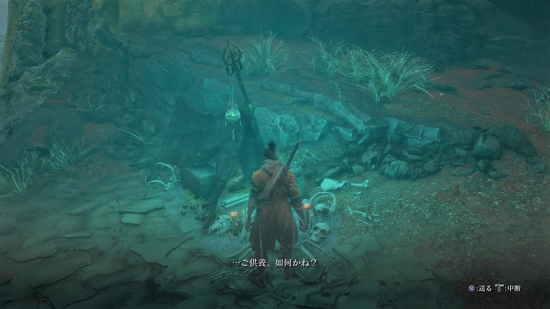 獅子猿がいた場所から反対方向へ行くと、こんな所にも店を開いている供養衆がいた。周囲が毒に満ちているせいか咳込みながら商売をしています。こんな所に人なんてこないから安全な場所に行ったほうがいいよ?供養衆の奥には洞窟があったので入ってみると、霧が噴き出してる怪しく物騒な場所だった。まぁ敵はいなさそう……、壁からなんか出てきた!? なんだこいつら亡霊か? びっくりするしこっちが殴っててもひるむことなく攻撃してくるので弾く準備もしときましょう。壁際にしか存在できないのでガン無視してもいいかも。奥には……ひっ、巨大蛇いるじゃん。そのさらに奥には社が見えるのであそこに行きたいですが素直に行っても喰われるだけだろうなぁ……。困り果てて周囲をよく観察すると、遠くに形代と猿が一匹いる……?猿を忍殺して傀儡の術を使ってみよう。これ頭に手を突っ込んでグリグリしてんだけど、どういう仕組みで操ってんだろう。猿を操ると囮になってくれて蛇の注意を引き付けてくれます。その隙に速攻で社に入りましょう。社の中には乾き蛇柿が置いてあった。なにに使うアイテムなんだろ……? 説明文見るに蛇の心臓なのだろうか。社から出ようとしたら蛇の体で出口を塞がれたんだけど!! ムカついたので斬りまくってたらタックルされて殺されました。ふんっ……この程度で我慢してやるか。蛇柿はわからんが獅子猿の所で手に入れた花を主に渡そうと思ってワープしようとしたら、できない……? どういうことだ葦名城へのワープが全て封じられているぞ。しかたないので捨て牢入口にワープしてそこから葦名城へ向かう事にしました。(行き方がわからずにしばらく迷子になってた)葦名城前には怯えてうずくまる侍がいた。何があったんのだろう。おや、なんだこの見慣れない敵は。謎の赤笠の兵士が葦名城から出てきました。二刀流で中々手強いけどまぁ白猿ほどじゃない。城内には赤笠の小さいおっさんもいた。こいつらガードするから嫌いなんだよな。めんどそうな敵は無視して葦名城に潜入します。城内にまでは赤笠はいないらしい。最下層には赤鬼がいた。しょうこりもなくまた作ったのか。炎上させてボコりましょう。以前に居合お爺さんがいた場所に孤影衆 忌み手がいた。頂上への最短ルートにはこいつが邪魔なので殺しておくかな。気軽に挑んだら紫忍者も沸いてきたんだけど!? 2体同時は無理だって!!速攻で殺された……。入口からよく見るとあんな所に待機してやがる……。まずはこいつを忍殺してから挑むべきですね。基本的な動きは紫忍者と変わらないので弾き方も同じようにいけば問題ないです。独自の行動として左手が緑の霧を纏うと毒攻撃がくるので距離をとった方がよさそうです。三連撃なので一撃目が終わったからといってすぐに斬りに向かわないようにしましょう。部下がいなければたいしたことないな!ではここらへんで(´0Д0)ノシ観柳キモすぎだな
