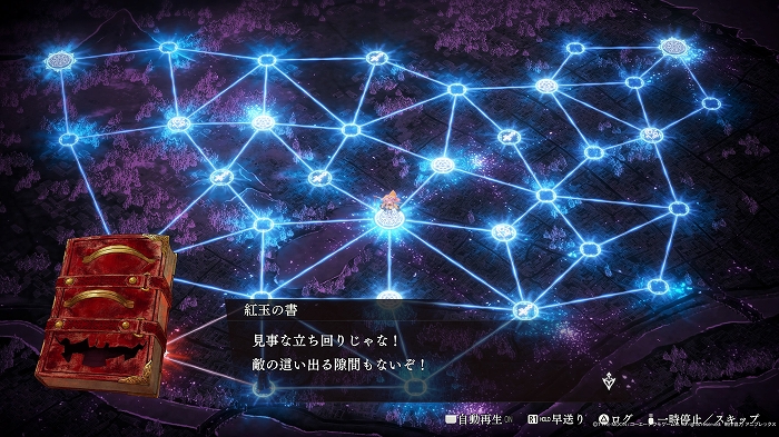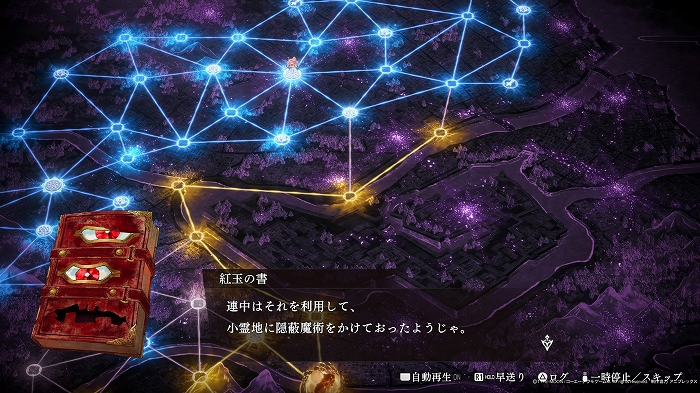 霊地争奪戦もコツをつかめてきたので全マス制覇だってしちゃう。背後の霊地をとって霊脈を断てば消滅するので敵をわざと侵攻させるのも手なのですよね。そういう行動すると紅玉の書が慌てる声だすからびっくりしてしまう。