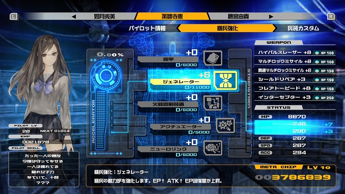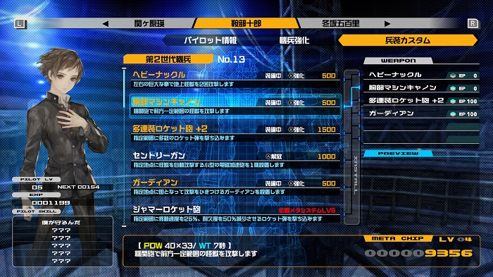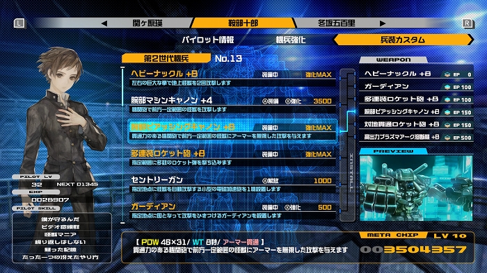 武器や機兵のステータスは強化ができます。色々あるけど範囲攻撃をメインで強化しつつ単発威力の高い武器は一つは強化した方がいい。あとEMP効果のあるやつ。まぁ使っていけばわかります。