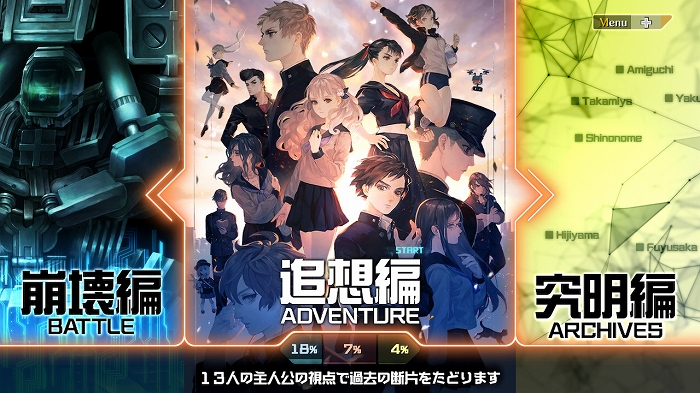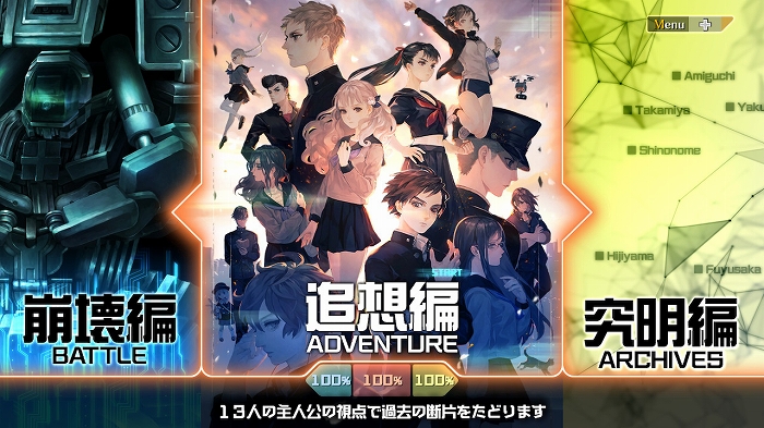 13人の主人公それぞれのストーリーを読み進めていく「追想編」、ストーリーの振り返りや世界観に関わる言葉が辞書のような形で読める「究明編」、そしてバトルパートの「崩壊編」の3種類があります。