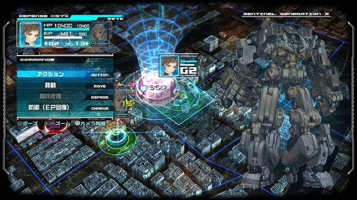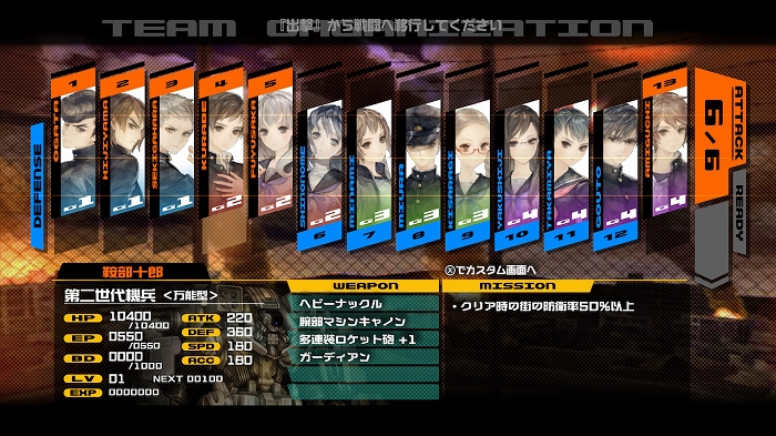 バトルパートとなる崩壊編。6人まで選出できて乗る機兵の世代によって性能が違います。近接特化や遠距離特化、万能型等色々いますがバランスよく編成した方がよさげ。終盤まで育ってくると遠距離メインの第三世代と第四世代がものすごく強い印象。