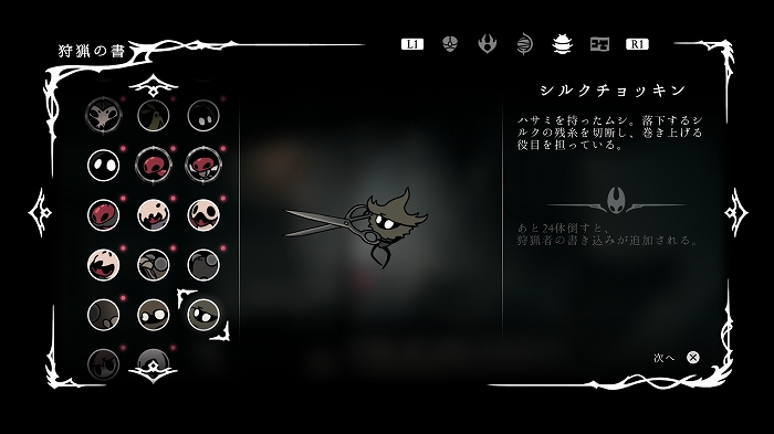 図鑑はこんな感じ。1回倒せば記録され、さらに規定数倒せば追記されるやつですね。