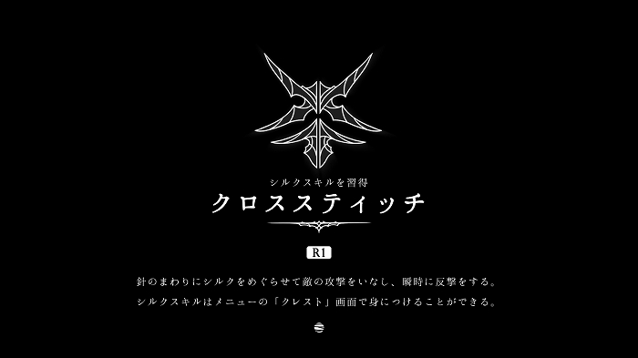 倒すとシルクスキル、クロススティッチを入手。カウンタースキルのようですね。攻撃が来るとつい避けちゃうんだよね……慣れが必要そうです。
