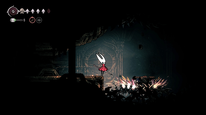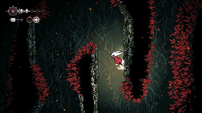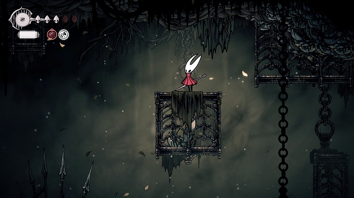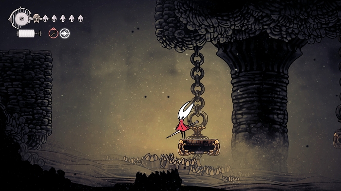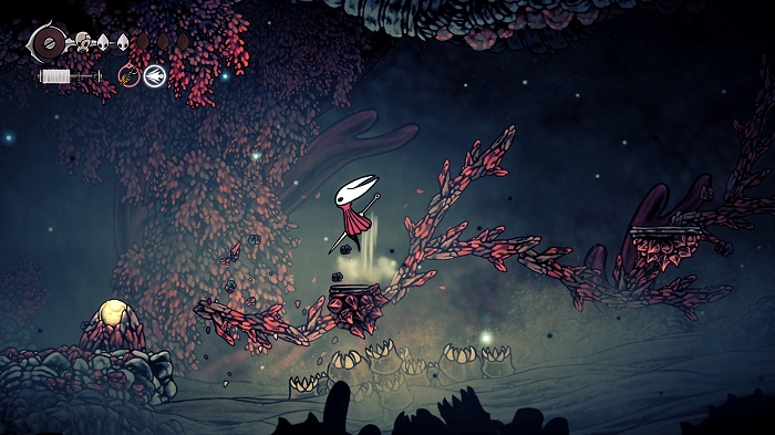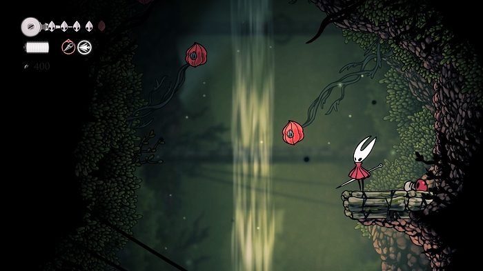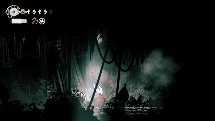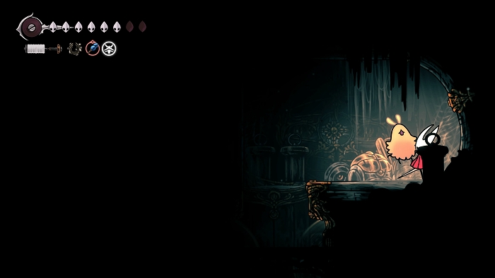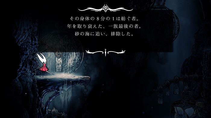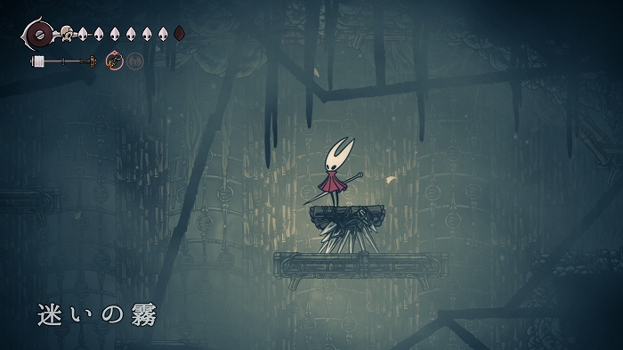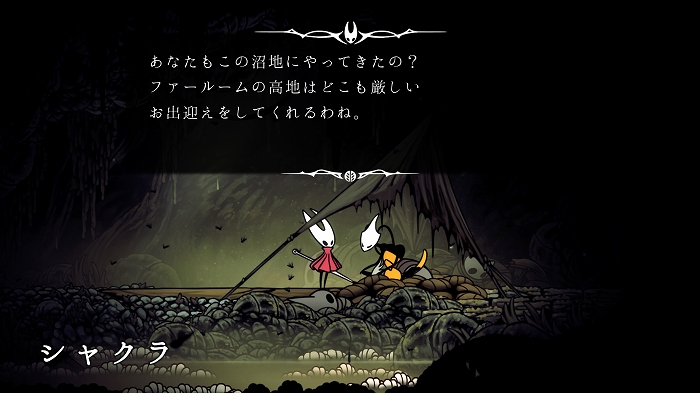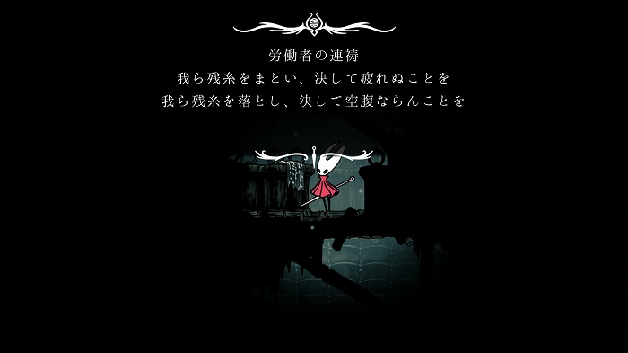 3つのメロディを揃え揺り籠内に入ったホーネット。何かの記録が残されている。いずれも紡ぐ者を排除しその任務のために犠牲になった使者の記録のようです。シタデルから執拗に紡ぐ者を排除したのは何故なのだろう……。で、このまま先に進むとラスボスっぽい雰囲気だったので一旦やってないクエストや行ってなさそうな場所を巡る事にしました。歌の集落にガーモンドお爺ちゃんも来てた。ここも結構賑やかになってきたね。骨溜まりの麓は寂しくなってるが残ってる人もいます。いつの間にか出来てたこの石像。攻撃できるけど壊すと怒られそう……。ふと気になって白い蝶の前でニードリンを使ってみたら声が聴こえてきた。ニードリンはこの白い何かに反応するらしい。なんの声なのかはわからない。クエストで巨石の牢に来たらボス、排卵の母に遭遇。突進後の隙を狙うだけで倒せます。突進後に振り返る仕草を見せたらまた突進してくるので注意。子供を召喚したら速攻で倒しましょう。倒せば目標の排卵の母の眼が手に……気持ち悪いな。銛での移動が出来るようになったし、ついでに近くのフェイの山を探索します。このエリアの探索は別の場所で寒さを防ぐ道具を入手してからするものだと思ってましたが、所々に温まる場所があるので凍えながらの探索を想定しているようですね……。水に落ちれば一瞬で死にかけるので絶対に落ちないように進みましょう。暖かい屋内に入ると本当に落ち着く……。銛で飛びながら進むという、ただでさえ忙しい動作なのにさらに寒さによる時間制限が加わって焦ってしまいミスりやすいのですよね。ベンチから右のほうに道具、記憶の水晶を発見。カウンタータイプの道具っぽいです。再び極寒の外へ。この暖を取れる光源って攻撃すると壊れるのですよね。当然暖まれなくなります。エリア移動すれば元に戻りますが、何故壊れる仕様にしたのか……。凍えつつ棘に怯えながら落ちていく。必死の思いでやっと登頂!! そこでニードリンを使用すると……、なんかでかい鳥が飛んできた!! え、ボス? 戦うの?と思いきや装備をくれるいい鳥でした。念願の2段ジャンプだやったー!! これで色んな所に行けるぞ! そしてなんと寒さを防ぐ事もできます。頂上まで来てやっとかよ!! 帰り道の途中で見つけた家に、仮面を作る者がいた。こんな所に住んでる人もいるのか……。しかしイベントが起こるでもなく会話だけで終わった。こんな意味深な場所にいるのに何もないなんてあるか?帰りは坂を一気に駆け下りていく。寒くないし気持ちいいね!2段ジャンプで行きたかった所、まずは地虫の穴の左にあるこの扉です。ニードリンで開くと、中は紡ぎの巣カルン。ひたすら奥に進んだ所で、シルクスキルのシャープダートを入手。全身攻撃ダッシュみたいな感じ。地虫の穴で湧いてくる虫をなぎ倒しながら進めます。……そういえばシルクスキル全然使ってないな。次はシタデルのこの場所。予想通り上へ2段ジャンプで行く事が出来、怪しい部屋があった。こういうの見つけるとワクワクする!中には傘のお化けみたいな敵が大量に湧いてる。いくら倒しても無限に湧くようなので無視して天井を破壊して上に行くと、シルクがばらけるような音と共に傘のお化けが消えてしまった。もしかしてシタデル内に出なくなったのか。あいつ色んな所にいきなり出てくるから助かりますね。ではこんなとこで(´0Д0)ノシ恋色の境界いいよね……。