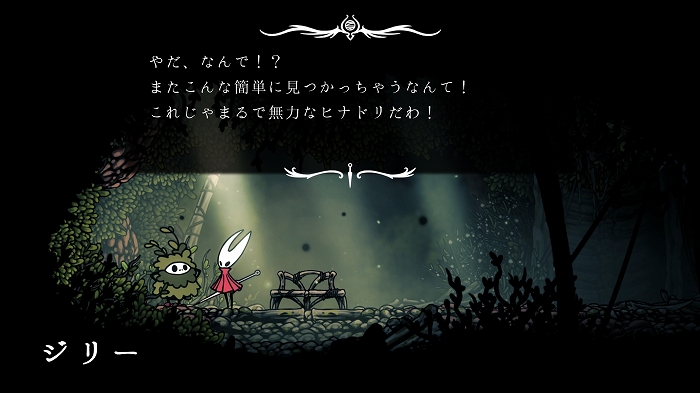 PS5でHollow Knight Silksongを始めました。待望のHollow Knight続編がついに出ましたね!! ず~~~~~~~っと楽しみに待ってました! 今回の主人公はホーネットという事なので、アクションにどういう変化が出るのか……細かいことはいいからとりあえずやってみよう!オープニングに出てくる詩。まぁわからん! 正直前作のストーリー理解してる? って聞かれたら「いや全然……」って感じなので今回もよくわからないかも! まぁ戦いがたのしければそれでいいので……あとは雰囲気づくりが上手ければOK!!ホーネットは何者かに捕らわれてどこかへ運ばれている様子。何があったのだろう。1章、ファールーム。さっきの詩に出てきた単語ですね。個人の名前?輸送中に檻ごと落ちて脱出できたホーネット。周りの苔がいい感じの雰囲気ですね。ここから自由に操作できるのですが、ホロウナイトといえば隠し部屋の存在! ここも右上に早速あります。破壊するとお金がもらえるオブジェがあった。これで終わりかと思いきやさらに右上に行けます。なんかいる。突進してくるのでさっきの部屋に戻りつつ空上攻撃を振ってれば倒せます。倒すと野獣の破片とやらをもらった。これってお金なのかな。先に進むと苦しんでいるかのような様子を見せる。すぐに元に戻るけどどうしたのだろう。朽ちたチャペルでベンチを発見。つまり近くには……、ボス、コケママが現れた! まぁ初ボスなので弱いです。ボスを倒して進むとチャペルの従者というムシ? がいた。口は悪いけど心配してくれるいいムシだ。その先へ歩くと……さぁっと一斉にコケムシが飛び立つ綺麗な風景が見れる。旅の始まりって感じがしていいですね。どんな冒険が始まるのかわくわくしてきた!そうして骨溜まりの麓に到着。ここが拠点となる場所のようだ。背景にある巨大なムシっぽいものはテントだろうか。店を見てみたら、どうやらお金となるものはロザリーというらしい。じゃあさっきの破片は何に使うんだ。まだわからないですね。拠点から進むと閉じた扉を前に歌で開けようとしてる可愛いムシ、シェルマがいた。もちろん扉はピクリとも反応しない。後ろから回って開けてあげると喜んでくれます。脊髄の道とやらに出た。脊髄……ここは巨大な生物の中なのか?ノミ族の長ムーシュカと遭遇。キャラバンって事は旅をしているのか。地図とかない? ないか……。今作の地図はこのシャクラから買って見れます。強そうなムシだな。うーん相変わらずアバウト! まぁわかれば大雑把でもいいか。右のほうに進んでいったら糸に囲まれた巨大なムシを発見。糸はいくら切っても再生してしまう。きっとこの糸を両断できる技があるに違いない。探索を進めていく中で結構この棘トラップを見かけます。何もなさそうな所でも油断しないようにしよう。しかし誰がこんなものを仕掛けたんだ……。さらに探索していくと謎の声と共にシルクの槍を手に入れました。さっきは切れなかった糸を両断できる。再生もしません。これでさっきの巨大ムシを解放できるね!ではこんなとこで(´0Д0)ノシ魔性の乙女の役廻り、もっと読みたかった……。