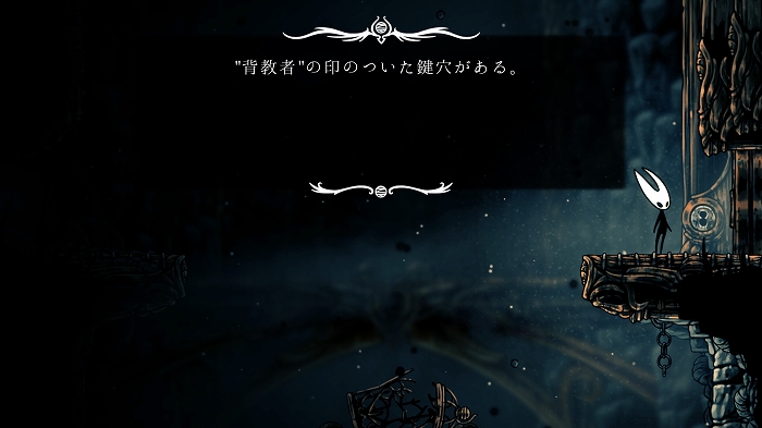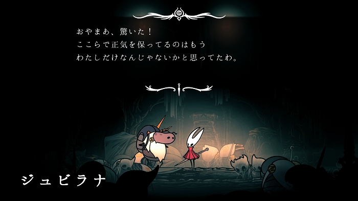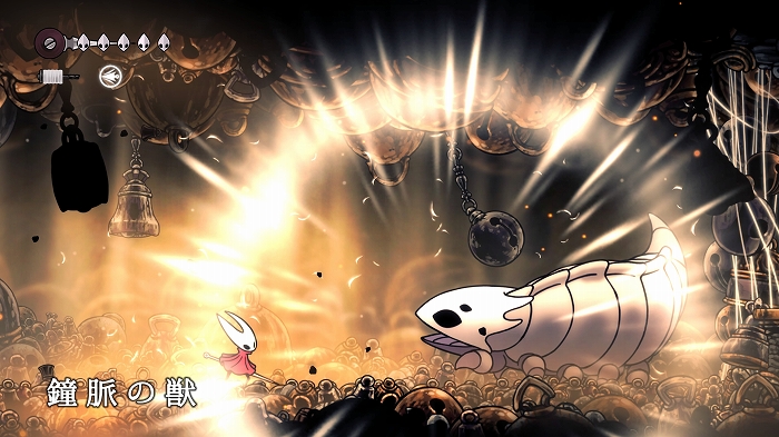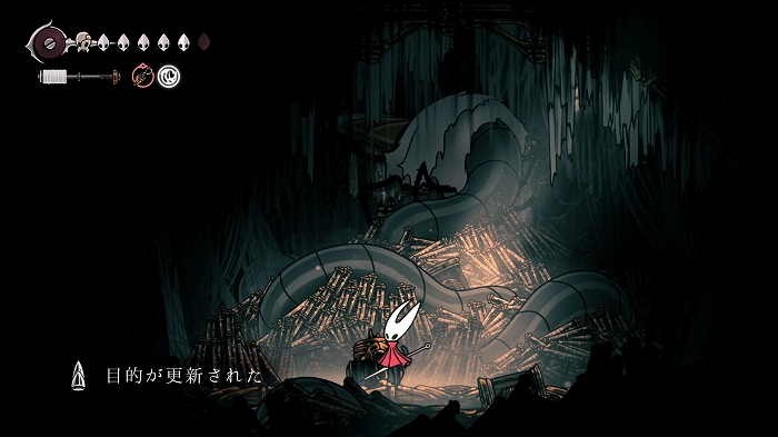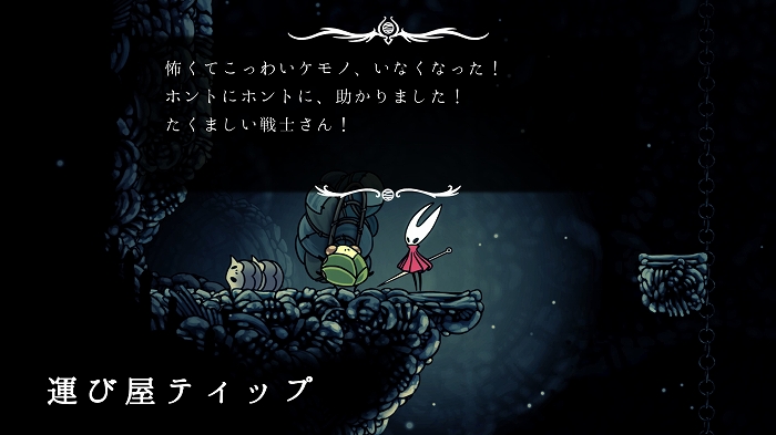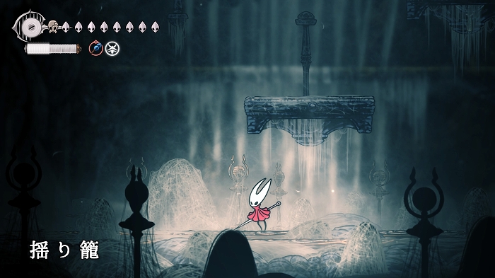 何者かに巨石の牢へと連れ去られてしまいました。近くの扉には鍵がかかっている。下へと降りるしかなさそうです。装備品がなくなってるので動きは初期のクレストとなってる。空下の癖が強いよ~!ホーネットの赤い服と武器を持ってるやつがいた!!! あの野郎……人を裸にしやがって。絶対取り返してやる!外に出ると寒すぎて一定時間経つと体力が減っていきます。速攻で中に入りましょう。顔見知りも捕まってました。お前いつも檻の中にいるな。どうやらお宝が目的のようです。ここの地図は亡殻に刻まれている。何故そんな所に……。ノミも捕まってました。君らは色んな所に散らばりすぎだな。また外に出てきた。明かりの近くに来ると体力が減るまでの時間に猶予が出来るので、あったまりながら進んでいきましょう。外でうろついてる敵は凍らないのだろうか……。装備品を奪った敵を上から強襲して奪い返しました。乙女(?)の服を奪うなんて不逞奴らだ。雑魚ラッシュ戦が始まるので落ち着いて倒そう。全滅させると異端者の鍵を入手。なるほど、これで対応した扉が開けられるのですね。こんな所にも鐘の道は通じてる。何故牢屋にまで? と思うが助かります。フェイの山とやらに通じているが高い段差が登れないので進めませんでした。それに寒さをどうにかしないと……多分、寒さを無効化する装備が手に入るのだろうと思います。巨石の牢は探索したのでとりあえずノミのキャラバンに寄ってみた。助けたやつが風呂に入れてくれるが、覗いてくる。スケベな目の通りの行動しやがって……ていうかホーネットの体って真っ黒だけど見れて嬉しいものなのか……? いやデフォルメ絵だからわからないだけどナイスバディの可能性もあるな。とりあえず覗いてる所を殴ると反省したのか次からタダで風呂に入れるようになります。入浴するとシルクが回復するのでまぁまぁ役に立つ。胆液の沼に戻って探索してたら、また迷いの霧に出た。しばらく彷徨ってみたがやっぱり進み方がわからない……。何かヒントが欲しいよ~!巨石の牢に連れてかれた場所には誰もいない。胆液の沼も探索できる所がなくなってしまった。とりあえずまだやってなかったクエスト、ポリップの心を探しに殻木の森に来た。あちこち探している内にベルハートへの道を見つけ、なんか怪しいやつがいた! なんでこの道に気づいてなかったんだろ……。というわけでボス、ウィドウです。ベルハートの縛られている住人達はこいつの仕業らしい。ベルを落としたり飛ばしてきますが、白い予告線が出るのでわかりやすいです。後半戦はベルの飛んでくる頻度が増え地上攻撃も頻繁にやってきますが、いずれも簡単に避けれるので苦戦はしませんでした。胆液の沼を探索する方が難しいかな!!ウィドウを倒すとニードリンとやらを取得しました。そして見知らぬ場所で目覚めた。ここはどこだ……?この扉の前でニードリンを使うと扉が開く。この扉どっかで見た事ある気がするな。そしてハープを奏でる謎の存在達。なんなんだこの光景は……。ベルハートに戻ってくると住人が戻り店も開いてました。拾った遺物をロザリーで買い取ってくれる店や、武器の強化をしてくれる人がいます。武器が強くなったの嬉しい!たしか苔の里辺りにいたシェルマも久しぶりに会えた。能天気なその感じでよくここまでこれたな。先に進んで目的地の前で待ってくれるそうです。可愛いね。ではこんなとこで(´0Д0)ノシ不滅のあなたへ、急展開すぎる。