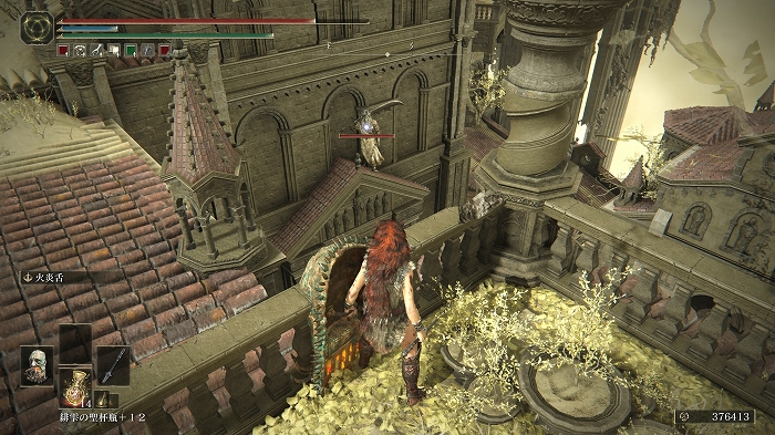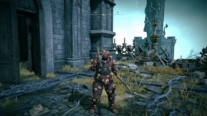 ラウフの古遺跡探索へ入ります。あの影を纏っているかのような建物、怪しすぎるので最終目的地って感じがしますよね。向こう側に渡ろうとしたら焼炉のゴーレムが火を吹いてきた。そこら辺にいる影人が燃えてて可哀想。私が仇をとってやるかr……地形の微妙な傾きで致命の一撃がいれられない!!!!!!! オレ、コイツ、ホントウニキライ。せめて致命の一撃1回で倒せてほしい。ゴーレムを倒して遺跡へ……あぁぁぁあぁあ!! 飛ぶサソリ!! きもい!!何故か腐敗エリアが広がってる、そして赤いシャコ人間もいる。何かを崇拝してる様子だが……。広場に神獣獅子舞を発見。高台から弓で狙ったらそのまま戦闘状態に入り一方的に攻撃して倒せそうでした。接近戦挑むとこいつ強いからな……。とはいえこれで戦士の名が廃る。やはり直接戦うか。キモカエル! 大量のキモカエル!!! 死のブレス! 即死!!!!!広場に踏み入れた途端にどこからともなく現れたカエルに即死ブレス吹きかけられまくったので遠距離だけで神獣獅子舞は倒しました。私は悪くない。ボス部屋へ入ると「蕾の聖女、ロミナ」がいた。巨大百足!!!! もう虫やだ!!!!! 百足と人間とサソリが合体したような異形の存在ですね。さらに蝶まで出してくる。蝶が飛んでる周囲は爆発するので離れた方がいいです。ちょっと見えづらいけど、表情が穏やかでにっこりしてるのですよね。人間としての意識はあるのだろうか……? 動きそのものはわかりやすいので適当に避けたりカウンターしてりして倒しましょう。ロミナを倒した先で封印の木を見つけた。これを焼くことで先に進めるようですね。メスメルの種火で着火。すると……、影が晴れていく……!すごい建物が出てきた!!!その場所の名は「エニル・イリム」ラストダンジョンっぽいかも。街の中では枯れ木のような人たちが熱心にお祈りしてる。蠅人まで祈りを捧げてる。もちろん全員背後から襲ってあげた。神獣獅子舞の頭を被った剣士がかなり強い。無名の霊廟のボス達は見習った方がいいと思う。ボスに挑むような心持で慎重に挑みましょう。このふざけたポーズとってるやつが足元に攻撃を超連打してくるのキレそうだった。上手く攻撃の間を縫って攻撃しましょう。こいつを倒してもこの先の階段の上から同じ事してくるやつがいてキレるかと思った。キレた。足元粘着マンを倒して重そうな扉をよっこらせっと……。ミケラの十字を見つけました。「恐れを棄てる」いよいよ覚悟が決まってる感じがする。トリーナに言われた通りミケラを止めてあげないとだな。ではこんなとこで(´0Д0)ノシうみちゃん可愛い。