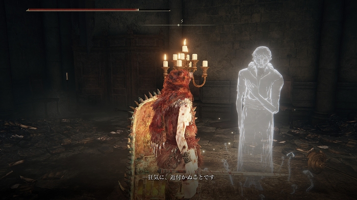 ミドラーの館を探索していきます。館に入ってすぐ帰るように警告されたけど、中でも霊体に近づくなって言われた。「狂気に」って言ってるしここは狂い火に関する何かがあった場所なのかなぁ。館内はどこも燃えたような感じです。これも狂い火のせい?そして気になる記述のアイテムを拾いました。森にいた「やつ」に触れた者の日記ですね。杖を突きつけられた時に払いのける事ができた……ははーん、これはわかりましたよ。「やつ」の攻撃をパリィすると攻撃できるって事ですね。………………まぁ私は今まで一度もパリィした事ないですが。やってみるかぁ……。「膨れたブドウ」というアイテムも見つけた。三本指の抱擁を直に受けた証……三本指と狂い火はどういう関係性なのか? 三本指の与える力が狂い火なのだろうか。そもそも三本指とやらはどこに……二本指との関係は? わからないことばかりだ。館内にも大量に巣くってる狂いネズミ。暗闇の中で目だけが光ってるの怖いな。これロード画面で見たやつだ!!! 中央の爺さんがミドラーなのでしょうか。イオリが召喚してたデブがいる。鬱陶しいから遠距離で倒しとこ。ボス部屋に入ると小さいミイラみたいなやつが襲ってきた。頭に何か刺さってるけど生きてるんだ。発狂ゲージが溜まる攻撃とかしてくるけど、ただの雑魚です。これがボス……?倒したけど体から色々貫通しててこれで生きてた方がびっくりする。自信に刺さった骨のようなものを引き抜き……、その頭部は黄色い炎で包まれた。「狂い火の王、ミドラー」です。君、さっきより背が高くなってない?? 狂い火の王と言うだけあってどの攻撃も発狂ゲージが溜まります。ガードしすぎるのも注意ですね。中に浮かんでから突進してくる大爆発は、浮かんだらすぐに離れた方がいいのだけど後ろが壁だとガードするしかなくなる。できるだけ部屋の中央で戦ったほうがいいのかも。狂い火をばらまくまくるので周辺に注意が逸れやすいです。しっかりミドラーを見据えよう。あと炎が地面に残ってる場所にはいかないようにしよう。頭のてっぺんから串刺ししてきたりする。ミドラーとお揃いだね!(即死) 基本的に全ての攻撃の後隙が大きいのでそこを狙うといいです。一つの攻撃の流れを覚えて最終弾を避けて反撃すればそこまで難しくはないと思います。ミドラーを倒したのでさっそく「やつ」にパリィを決めてみる。タイミングを把握するのに苦戦したが、一度成功するとよく決まる。倒すと爛れたブドウを落とす。そして倒した個体は復活しません。翁の歓喜というタリスマンを落とすやつもいた。周囲に発狂状態が発生すると攻撃力が上がるそうです。使う機会はなさそう。奈落の森を探索した事で行ってない場所は多分なくなったと思います。いよいよラウフの古遺跡探索を進めて行きましょう。ではこんなとこで(´0Д0)ノシダンダダン、囃子の演奏格好よすぎる。