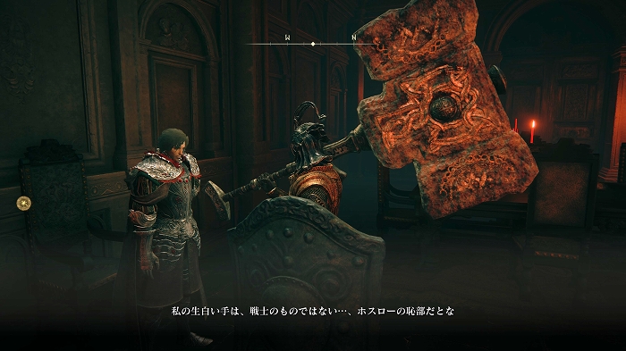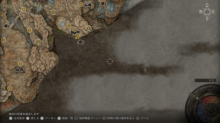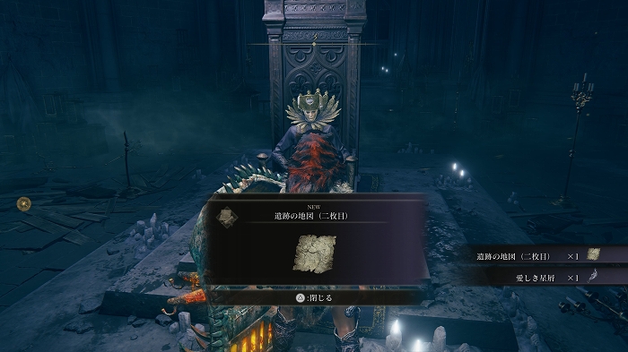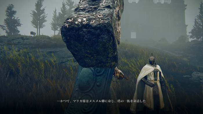 全体マップの南東部分が、このように地図未入手な状態です。どこからこのエリアに行けるのかさっぱりわからない。方角的にあの山を探索できると思うが……墓地平原より下層の方へ降りていく道が見つからないのですよね。うろつきすぎてもう迷子状態です。近くにある霊気流で飛んでくると懲罰砦……いやここはもう探索したはず。と思いつつ探索してみたら来てない所がありました。地下室があったのね……こんな死体だらけの所に来ても嬉しくないが……。そして特に新発見な事もなかった。何故か倒してなかったボス「黒騎士エドレッド」に遭遇。ボスといっても見た目は雑魚黒騎士と一緒に見えるが。強攻撃してれば倒せます。懲罰砦を出てずっと北側へ行った湖付近に「大赤熊ラルバ」がうろついてました。ルガリアともうやりあってるので特に苦戦はしない。影の城の付近に転がってる焼炉ゴーレムで気になるメモを見つけました。この説明からするに頭に火炎壺投げる事で大ダメージってこと……?早速試してみます。脚を攻撃してもダメージを与えられない個体はきっとこの方法で倒すに違いない! 高台に登って近くまで寄ってきたら壺を頭に向かって投げます(初めて壺を使った)大焼炉壺を3つ投げ入れたら倒せた!! …………ただまぁ投げ入れるのが難しい上に、ゴーレム自体が火球噴火しまくるのでものすごく疲れます。脚斬ってた方がまだ楽じゃないかな……。大赤熊ラルバから西へ行った方で「聖戦教会」を発見。「火の騎士、クウィンライン」が侵入してきた。メスメルと同じ台詞を吐きながら登場しましたね。もしかして部下の方ですか? メスメルなら私が殺っちゃいましたが……。というわけで部下? のクウィンラインも同じ場所に送ってあげましょう。火球とか投げてきますが適当によけて攻撃してれば倒せます。聖戦教会の近くで丸くなって寝ているシャコ人間を発見。ロックオンできないから敵ではないらしい。寝てるってか死んでる? まぁ攻撃してこないなら放っておいてやります。南の方に行くとミケラの十字とレダを見つけた。モーグウィン王朝にいた人ですね。「ミケラの魅了が壊れた」とは大ルーンが壊れた時の事? 感じたと言われても私にはミケラに魅了された覚えはないです……。モーグもどっかから攫ってくるくらいだからミケラは人気者なんだね。「エンシスの城砦」を発見。地図で見ると墓地平原から真っすぐに来そうな場所なのにスルーしてました。魔術使いそうなトロルが待ち構えてますが……、周囲を探索してたら地下墓教え石像を見つけたので先にそちらへ向かいます。「霧谷の地下墓」を発見。棘付き天井落下トラップが仕掛けられてるのでタイミングを見て進もう。ボスは「死の騎士」またお前か。今度は両手斧タイプです。以前と同じようにガード不可掴みは警戒しましょう。通常攻撃の終わりやワープ後の攻撃に対してカウンターがやりやすいかも。ここにも人面痕……なんなのかわからなすぎて気味が悪い。「エンシスの城砦」に戻ってきました。ミケラの十字がここにもある。肉体を削ったミケラはどうやって旅を続けてたのでしょうね?入口の魔術トロルがいましたが、他にも石像被った魔術師やカーリア騎士がいます。狭間の地から来たのでしょうか? どういった関係性があるのでしょうね。ボスは「双月の騎士、レラーナ」この場所、カーリアの城館に似てますね。椅子は1個しかないけど。二刀流で攻撃が激しいですが連続攻撃を最後まで受けてカウンターしていきます。体力をある程度減らすと右には冷気を左に炎を纏ってくる。異なる属性を使ってくるの格好いいな! ここからはガードしても魔力ダメージ削りが入るので注意です。クソデカ魔力剣。距離を離してるからといって油断してると真っ二つにされます。回復する時も注意しましょう。ただの振り降ろしなので避けるのは簡単です。よくわからないのが二つの月が出てきて、地面に着弾するとフィールド全体に衝撃波が出るやつ。タイミングよく回避すればいいのだろうか。あまりうまくいかないのでガードしてました。厄介なのが炎剣は斬った後に炎が残ったり時間差で爆発するので攻めづらくなります。攻撃を避けつつ慎重に攻めるタイミングを見計らっていきたいですね。レラーナを倒しても墓地平原から影の城方面へと道が開通するだけなので、未探索エリアへは関係なさそうでした。じゃあどうやって南東エリアに行くんだ……。ではこんなとこで(´0Д0)ノシカツラおばけに怯える妹ちゃん可愛い。