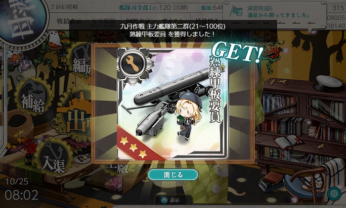 八月作戦 主力艦隊第二群に入りました。うーん……良い目のささやか! 陸攻が改修値付きなのでいい感じでしょうか。改修分の数値を含めると爆装値がほぼFritzX並なので結構強いですね。大型主砲は次イベでイギリス艦が実装されるという匂わせでしょうか……。この主砲自体の使い道は薄いので微妙な所。先月は100位以内を目指してギリギリな感じで走ってたと思うのですが、98位と実際にかなり危ない所でした。一生懸命周回しててよかった~! 諦めないって大事ですね!そして今月も100位以内の予定です。順位的にも余裕の位置にいるので慌てずにすみそう。本当は戦果任務を使わずに500位以内の予定だったのですが間違って達成ボタンを押してしまい、それならばと追加で任務を使って順位を上げておきました。来月、再来月の事はその時の自分がなんとかしてくれるでしょう!さて、現在艦これはハロウィンイベントの開催中です。そんな格好してるとFANZAGAMESだと勘違いされちゃうだろ、このムチムチ鯨姉妹はよぉ~!!!! 迅鯨にいたっては獣の眼をして明らかに提督をいただこうとしてるでしょ! 艦これは健全なゲームです!R18扱いのような痴女はおいといて鵜来ちゃん可愛いね!! お菓子いっぱいあげちゃおうね!深海棲艦も可愛くデコってる。ハロウィン任務で来たけどイベントにはしゃいでるみたいで可愛い。戦ってるけど深海棲艦とはプロレスでじゃれてるだけですからね。一緒に楽しみましょう。今回の南瓜はアイテム入手にも使うのでそれほど運改修に使えなさそうなのが残念。榛名と霧島の運をカンストまでもっていきたかったけど数が足りるかなぁ……。秋刀魚みたいに海でドロップしてくれない? 無理? そう……。ではこんなとこで(´0Д0)ノシ来期アニメ、気になるのが続き物ばかりで新作がない。