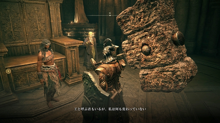 セレン師匠の生き様を見届けたので今度は火山館イベントを進めていきます。火山館の依頼を進めていくとディアロスのイベントも進む。火山館の一員になってはみたけどあまり納得してるようには見えない。あなたは戦いに向いてないと思うよ。ラーヤのイベントでは驚きの正体が明らかになります。実は蛇人で本当の名はゾラ―ヤスと教えてくれました。蛇人だとうっかりでバレちゃうの可愛すぎる。蛇人でも可愛いね。さらに火山館のイベント進めていくとディアロスが壺村で現実逃避し始めました。どうやら壺師になるらしい。まぁそういう人生の方が向いてるんじゃないかと思います。ところが壺村を密猟者が襲撃してそれに立ち向かった結果死んでしまった。守れたのは小さな壺人一人だけで他の壺人は全滅してしまいました。まぁディアロスの強さではしょうがないですね。しかしその生き様は小さな壺人に何かを残したようです。しんみりする終わり方だな……。ラーヤイベントでは自身の出生を知った結果、褪せ人に殺してくれと頼んできました。どんな生まれでもいいじゃない……。手を下すのは躊躇われるので保留させてもらいます。王都へと入る前のツリーガード戦。ミリセントとトラゴスを召喚できるので頑張ってもらう図。この褪せ人いつもNPC頼りで眺めてるだけだな。コリンイベントを進めていると闘技場近くで金仮面卿と一緒に黄金樹を眺めてるのを発見。どうやら金仮面卿が止まってしまい困惑してるようです。いつも動いてないように見えるけど?ラダゴン像の前で回帰性原理を使うと現れるメッセージ「ラダゴンとはマリカである」を金仮面卿に伝えると何かに気づいた様子。これどういう意味? そういえばラダゴン戦は崩れたマリカの体から出てきたような感じだったな……。たしかマリカとラダゴンの間にも子供がいたよね? え、単為生殖って事? まぁ神様だからそこら辺はなんでもありか……。モーゴット戦では糞喰いとメリナという豪華なメンバーを召喚できる。メリナが戦う所なんて貴重ですね。これに加えて遺灰も召喚してモーゴットをボコボコにしちゃいます!1周目では気づかなかったのだけど、モーゴットを倒した後に話しかけられたのですね。すっかりしわしわのミイラみたいになってるけど……。ハイータイベントを進めていると王都地下にまでハイータは来てます。盲目でよくこんな所まで来たな。あの絶妙な足場ジャンプをどうやって進んできたのだろう。今回狂い火を受領する気はないのでハイータイベントはここまでですね。セルブスイベントでは薬を眠ってるラニに飲ませて傀儡化するよう頼まれます。睡眠姦なの? 変態魔術師がよ……。そんなもん自分の手でやれや!!セルブスに言われるままラニに薬を飲ませるが……効いてねーじゃねーか!! 何度も話しかけてたらラニに即死させられました。もちろんこの後セルブスも死んでた。何故か召使いのピディも死んでる。というか傀儡に襲われて殺されたようだ。このままではラニと敵対状態でイベントが進められないので贖罪してなかったことにしてもらいましょう。ちょっと祈るだけで許してくれるなんてラニは優しいなー。ラニに指殺しの刃を渡してエインセル河へ行くと小さなラニ人形を拾う。すると近くの祝福で話しかけられるようになります。「ここまで来たからには私に協力してもらうんだからっ」なんてヒロインの様な口ぶりですね……。進んでいく道中ではラニ自身やラニの旅の目的が語られる。ヒロイン力上がってきたな。最終的に「災いの影」と戦闘になる。見た目はブライヴのようだが……。倒すと鍵を拾う。その鍵でレアルカリアのレナラの近くにある宝箱を開けると暗月の指輪が手に入る。「ラニがその伴侶に贈るはずだった冷たい契りの指輪」これを置いて行ったってもうそれは告白なのでは? ラニのヒロイン力がどんどん上がってきてる。メリメリどう思う?指輪を持っているとアステールを倒した先に進めて「月光の祭壇」に行けます。空を見上げると黄金樹に隠れるようにもう一つ月が見える。あれが暗月なのか。「ヒエロナの魔術師塔」を発見。封印されているので、でかい3匹の亀を倒すと封印が解けます。結構広い範囲にいて飛んでる個体もいるので探すのに苦労しました。なんで亀が飛んでるんだよ!「刃の長の封牢」を発見。中には「黒き刃の長、アレクトー」がいる。ラニと黒き刃は敵対してるようだからラニを追って来た奴がここに封印されてたのかな。あと「輝石竜アデューラ」がいました。以前出会った時に逃げられたがようやく仕留められる機会が巡ってきたな。その輝石だらけの頭をハンマーで砕いてやろう!「マヌス・セリスの大教会」を発見。影の地の「マヌス・メテルの大教会」と関係ありそうな名前ですね。こっちは大分朽ちていて荒れ果ててますが……。教会の中には地下に続く穴がある。という事はこの先には……。切り裂かれて絶命しているように見え