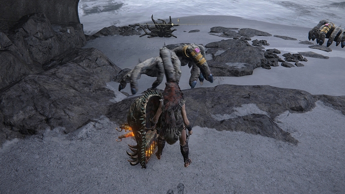 石棺の大穴から出てギザ山から見えてた謎の指岩がある所を目指していきます。海岸沿いに指の化け物がウロウロしてる……ここら辺のは指輪をしてるんだな。巨人の山嶺の個体だけが指輪をしてないっぽいがどういう違いなのだろう。「リアの指遺跡」に出まし……不気味すぎるだろう。なんだこの突き出た大量の指は。虫みたいに壁に引っ付くんじゃない! 気持ち悪いだろ!!指の形をした岩だけでなくこういう球体の岩がめり込んでるのも気になる。球体状で降り注いできてそこから指状に変化するとか? なんで指なんだ……?遺跡には腕の生えたヤツメウナギみたいなやつがうろついてます。目の位置キショいな。中央辺りに吊り下げられてる岩を発見。近づくいて調べると、穴に顔を突っ込んで岩を笛のように吹いた。そしてタリスマンを入手。そしてこの場所はこれだけしかイベントがありませんでした。かなり広く意味深なエリアなのにボスもいないし入手できる特別なアイテムもない。こう、何か……もっと何かあってもよさそうな雰囲気なのに!あと全く関係ない話なのですが、今の防具って横乳と太ももが楽しめていいですよね。少し離れた所に「指追いのボロ家」があり、霊体が気になる事を言ってます。これはつまり二本指がこの遺跡から生まれたという事なのだろうか?指遺跡の探索は済んだのでギザ山に戻ります。ギザ山の麓から北側へ行くと2匹の竜が争ってる場面に遭遇。とりあえず片方が死ぬまで待って、残った方を倒します。竜との戦闘が終わると聞き覚えのあるやかましい声が……。声の方へ向かうと、竜の穴の前にいたうるさく叫んでる人がいました。どうやらベールとの戦いの時に呼んで欲しいそうです。気持ちはありがたいですが、1周目ではNPC召喚しない主義なので……。叫び人の願いは無視してギザ山を登っていきましょう。道中は岩が転がり落ちてくる。天然の落石トラップ怖いですね。山中では「古竜セネサクス」が待ち構えています。馬に乗りながら適当に斬ってればOK。山頂へと続く道には無数の竜の死体が転がってる。なんでこんなに死んでるんだろう……。山頂付近では橙の雷が頻繁に落ちてます。曇ってるし天候が悪いってレベルじゃないぞ!ボス部屋に入ると「暴竜ベール」と対峙。今まで戦って来た竜とは明らかに違う体格ですね……「暴竜」の名に相応しい風格を感じる。よく見ると脚が片方無い……? かつてプラキドサクスと戦った時の傷なのでしょうか。なんてぼんやり観察してたらいきなりガード不可噛みつきくらった!! 開幕これ多くない?自機狙い雷撃ってきたら動き続けてよけましょう。動きが止まって攻撃したくなるけど我慢!基本的にロックオンしないで後ろ足に強攻撃を当てる立ち回りでいきます。正面怖い。この戦い方だとその場ブレスが痛いので、呼び動作に入ったらすぐに範囲外へ逃げます。ある程度ダメージを与えると溜め動作から爆発した!! そして空へ飛んで火球ブレスを何発も撃ってきます。レウスワールドツアーやめろ。ブレス自体は走り続けてれば当たりませんが、ブレスが終わるとこっちを狙って突っ込んできます。もう派手すぎてなにがなんだかわかんないよ!後半の行動はとにかく苛烈で休む暇なく襲ってきます。一番ヤバいのが空中からの2連直線ブレスで、ブレスを避けても直後の爆発で吹き飛ばされるのですよね。2射目は左側に回避すると当たりづらい気がしますが……よくわかりません。あと前半から使ってくる直線ブレスが避けられたり当たったりでよくわからない。ギリギリまで待ってから避けても狙ってくるしなんなんだろう……。とにかく後ろ足を強攻撃で斬りまくってダウンからの致命の一撃を狙っていきます。回避のしすぎで辛いので今だけ回避距離+2とスタミナ急速回復のスキル欲しいなぁ!!なんとか倒して心臓を入手しました。こんだけ暴れるやつの心臓とかめっちゃデカそう。いやーでも派手で強い竜って感じで楽しかったですね!祭壇に戻ると巫女の姿はなく心臓が落ちていた。え、死んじゃったの? なんで……。うるさい人もいなくなってました。そういえば呼んでくれって言ってたの忘れてた。まぁ呼ぶ気はありませんでしたが……。落ちてたエーゴンの大弓が結構強いのでありがたく使わせてもらいます。次は地図の上の方に見える指遺跡を目指そうかな。ではこんなとこで(´0Д0)ノシサカモトデイズの昌可愛い。