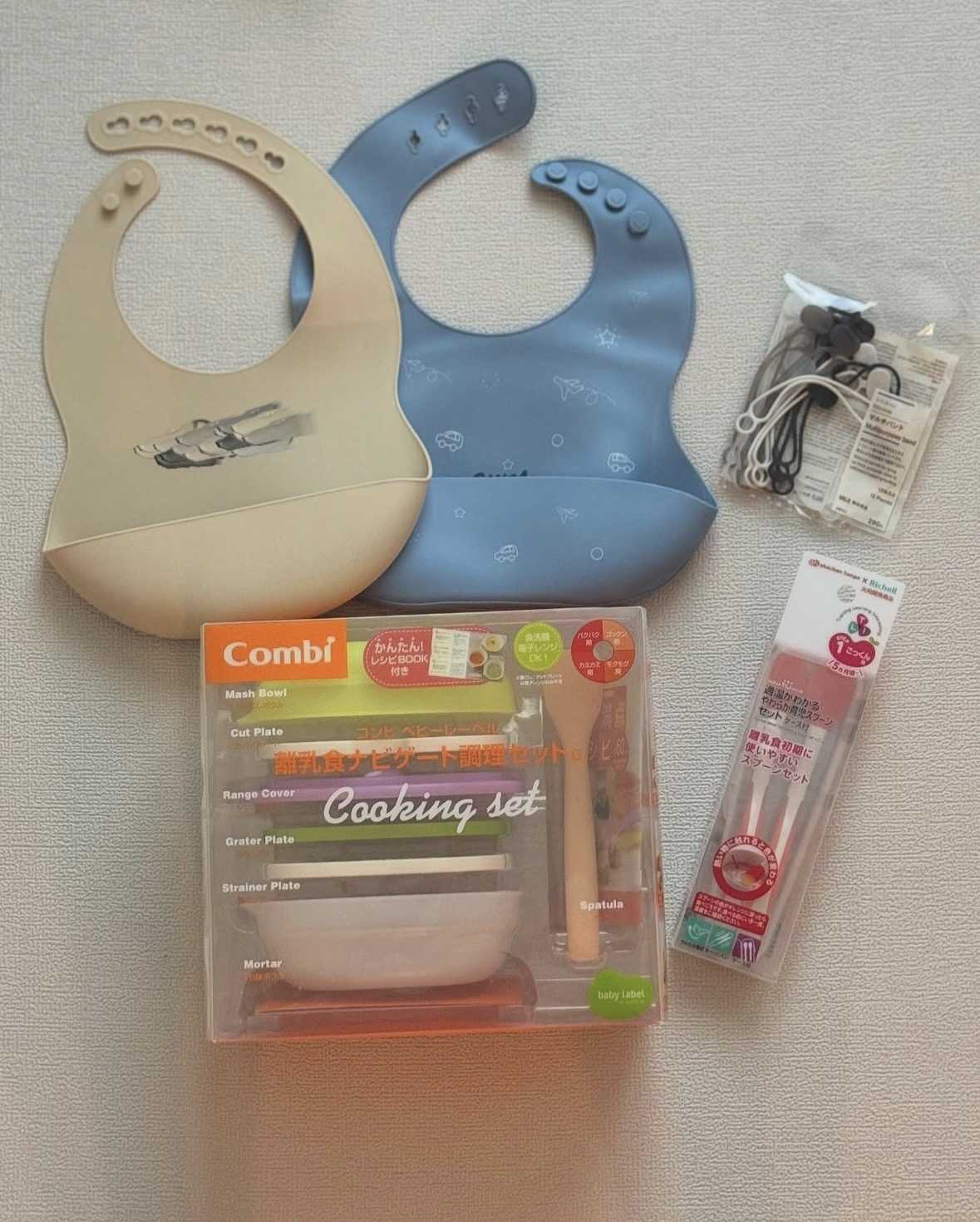 ※遡り投稿です。離乳食準備はじめました!!とりあえず購入品紹介します💖☑名前入りシリコンビブBaby Bjornは重たいから始めは気になっちゃうかも....ということで食べこぼしもそこまで少なくないし、持ち運びする時はシリコンにしようかなと思ってたのでお名前入りをオーダー♡*゜🛒楽天で購入☞ 名前入りシリコンビブ☑combiの離乳食ナビゲート調理セット使いやすいとの口コミを見て!コンパクトになるのもポイント🛒楽天で購入☞ 離乳食ナビゲート調理セット☑アカチャンホンポ×richellコラボの温度がわかる離乳食スプーン温度がわかるのは嬉しい☺️店舗で買おうとしたら新デザインになって、値段倍近くになってた💦旧デザインが良かったから取り寄せたけど値段そのままでよかったぁ〜😭☑無印のシリコーンマルチバンドおもちゃをベビーカーにつけたり、お菓子止めたり色々便利らしいので🥺seriaにもあるけど、個数単価は無印の方が安い✨