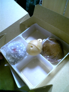 左端は イチゴ大福 。これは 餅のかわにあんこも皮ぐらいしか入ってない位いちごメイン 。伊勢丹着いてすぐにこれ作ってるとこ見て絶対食べたいって! とってもジューシーなのに少ないあんこがちゃんと存在感あって、なかなかうまい!!ぞ!