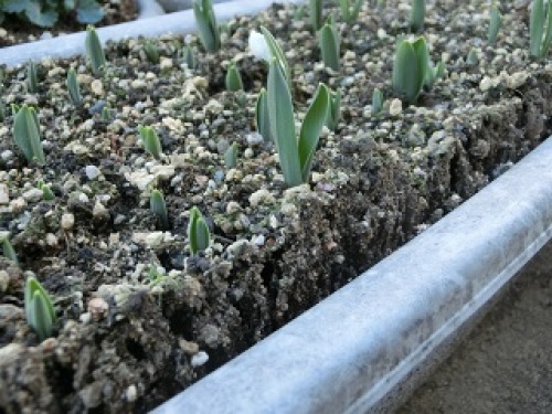 今日は気温9~12℃、曇り一時雨である。(オキザリス・バーシーカラーは今日もお休み。)明日は気温4~9℃、晴れの予報であるが、最高気温が1桁なのはこの冬初めてかも知れない。9月に球根を植えたスノードロップとチューリップ・ザ・ファーストが発芽した。(スノードロップ。6号鉢に14球植えてある。)(チューリップ・ザ・ファースト。8号鉢に8球植えてある。緑の葉はこぼれ種マラコイデスなどである。)スノードロップは昨年の発芽は12月4日だったので今年もほぼ同じである。チューリップ・ザ・ファーストは昨年の12月12日よりはちょっと早いが、2011年と2012年は11月に発芽してるので特に早いというほどではない。開花はスノードロップが1~2月、ザ・ファーストが3月の予定である。(今年2月のスノードロップ。)(3月のチューリップ・ザ・ファースト。)なお、スノードロップは球根が保存中の夏の暑さのためか激減しており、今年は1輪しか咲かず、来年は咲かないかも知れない。・・・・・・・(ナスタチウム。撤収時期であるがまだチラホラと咲いているので撤収しそびれている。)(サルビア。これも近々撤収するつもりである。)