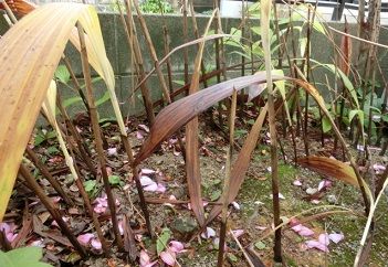 今日は気温7~17℃、晴れのち曇りである。明日は気温11~18℃、晴れの予報である。10月26日に植えたスパラキシスが発芽した。(スパラキシスのプランター。とりあえず1本発芽。)植えた時には芽がだいぶ伸びていたので、順当な発芽である。今日のところは1本だけであるが、いずれ他の芽も出てくるはずである。・・・・・・3種類あるオリエンタルリリーのうちコンカドールを植え替えた。コンカドールは15年7月には開花したが、その後、2年連続でコガネムシの幼虫の集団に食われて小さな球根しか残っていなかったものである。(しかも昨年11月の植替えでは小さいながらカケラも含めて7球植えたのだが、)(そのうち発芽したのは1本だけだった。)(今日のコンカドールの鉢。赤〇は枯れた茎。)(掘り上げた球根。枯れた茎の下に球根が4球あった。今回はオルトランを時々散布した効果か?コガネムシの幼虫はいなかった。)(6号深鉢に4球とも植付け。)(左は今まで植えていた8号深鉢。)7球植えたのが何故1球しか発芽しなかったか不明であるが、消えた6球はコガネムシに食われたダメージがあったのかも知れない。おそらく来年も開花は無理だと思われるが、まずは無事に4球とも発芽してもらいたいものである。(15年7月に開花したコンカドール。)・・・・・・(ミョウガ畑にマラコイデスをまず24株植付け。累計201株。)(さらにプランターに4株植付け。累計205株。)(ビオラ2株を追加購入。)