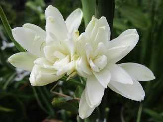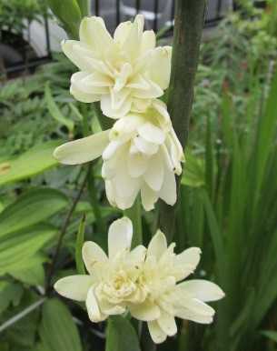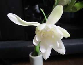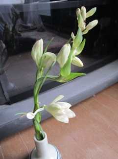 (昨年11月のチューベローズ。花穂が強風で折れたために花びんに挿したが完全には咲かなかった。)