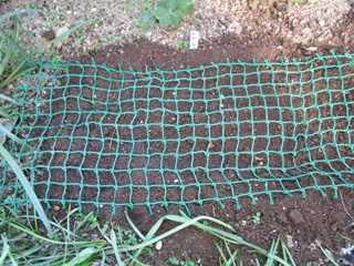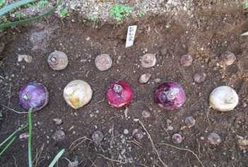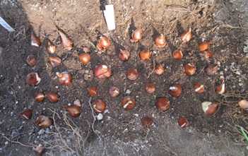 (穴に球根を配置してから土を被せ、ネットを張って水やりをして作業終了。)