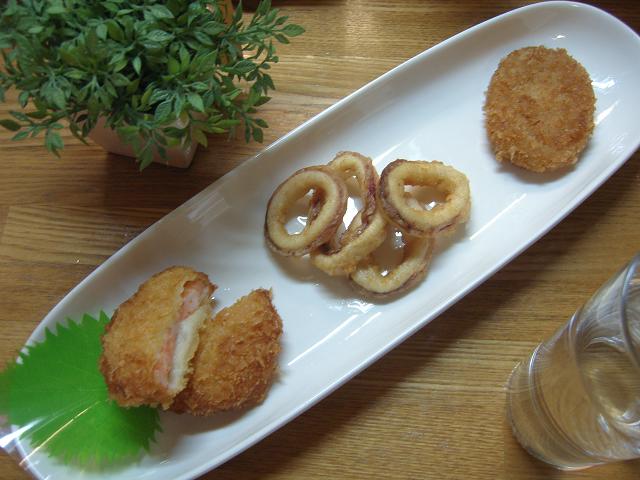 ぷりぷりエビがいっぱい。。実においしい!!揚げ物は電気フライヤーにおまかせっ。これ便利です。蓋して待つこと4分。さっくさっくのエビカツがっ。今日のごちそう!!!イカフリャ~ぁ~と、かにクリ~ムコロッケもお仲間。それでは晩酌タイムに移らせていただきます。。材料はぜ~んぶおうちCOOPでした。。