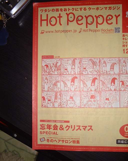 ホットペッパーとってきた。盗人ではない。もらってきたのだ。「ホットペッパーありますか?」「はい。お待ち下さい。」 うちの近くのローソンは、一人でたくさんもってかえるものがいるので、店の奥に隠してある。それを店員にもらうのである。場所に寄ってはそのまま置いてありフリーで取り放題のところが多い。友だちの分・あるいは自分の予備の分ということでどんどん無くなっていく。従って良心的な店は、こうやって店内に保管してある。しかしながら、いつも申し訳ないと思いつつ、これだけをもらいに入る。そこを割り切って店に入るあのドキドキは計り知れないものがある。なんかついでに買ってあげようかな??いやいや。ここはがまんがまん。いろいろな葛藤がありただでもらうのだ。まあ、ローソンへ入っている客のさくらとして、その分お店に貢献しているのだと思えばいいのである。みなさん。もらえましたか???今からいっても、もうないかもしれません。