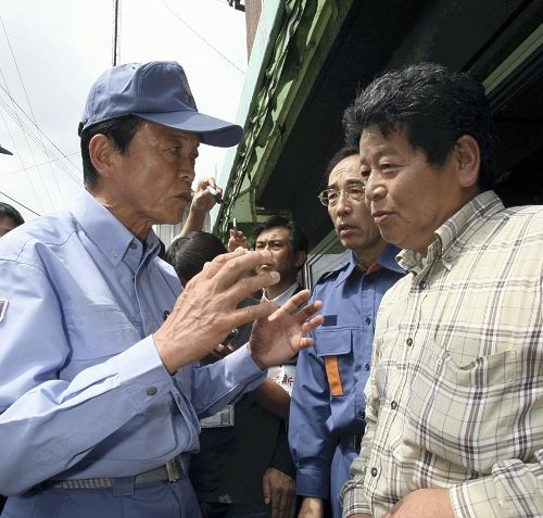 がんばらなきゃいけませんよ。・・・・・・・・・・・みんなやることやってるよ。遺体が見つかるよう・・・・・・・遺体をさがしているんじゃないよ。命をさがしてるんだよ。結局麻生さん何しに来たの。もう首相の座から蹴落とされるのは、時間の問題。はとさんに見に来てもらわねば・・・・・たったの20分で、一番大変だったところも回らずに帰っていった。大顰蹙(爆)麻生首相は22日午前、台風9号による豪雨で被害を受けた兵庫県佐用町の被災地を視察した。首相は羽田空港から神戸空港までは航空自衛隊機で移動し、ヘリコプターに乗り換えて上空からも視察する予定だったが、悪天候のため、陸路で同町に入った。 首相は、町役場で庵逧(あんざこ)典章町長から、18人が死亡、約1400棟が床上・床下浸水するなどした被害の説明を聞いた。その後、JR佐用駅前を訪れ、濁流で泥まみれになった店舗で被災者らに約10分間、「頑張らなきゃいけませんよ」などと声をかけた。 「商店街は壊滅状態。早く立ち直れるよう支援を」と伝えた美容室経営の梅本三千代さん(58)は、「『何でも言って下さい』と言われ、心強く感じた」と話した。 視察後、麻生首相は「改めて被害の大きさを知った。ボランティアのおかげで復旧も進んでいるが、国としては、激甚災害指定など要望に沿って対応する」と語った。今も行方がわからない人々について、「捜索にあたっている方々は、遺体が見つかるよう、今後とも努力していただきたい」と述べたが、その後、秘書官を通じて「遺体」を「行方不明者」に訂正した。 視察に先立ち、麻生首相は神戸空港で井戸敏三・兵庫県知事と会い、商店街、中小企業、河川復旧に対する被災地支援など6項目の緊急要望書を手渡され、早急な復旧・復興の支援を約束した。(2009年8月22日 読売新聞)関西発 ニュース