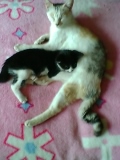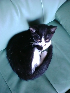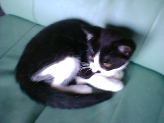 さて黒こねこ。こんどは縦長のQVGAサイズでアップです。まあ普通なポーズのこねこ写真かもしれませんが、ウチのやんちゃ盛りな黒こねこがおとなしく寝ているだけでも貴重な写真だったりします。ではどうぞ。(^^)ねっ、かわいいでしょ。(^^ゞって、じつに親バカです。(汗)
