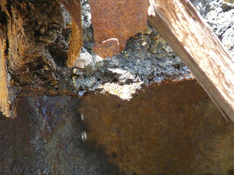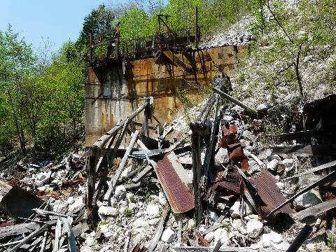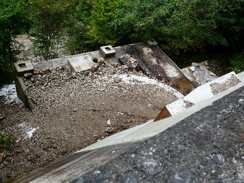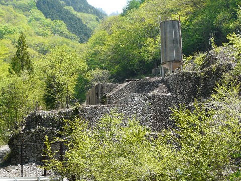 崩落に巻き込まれたらしい索道施設跡(涙)。 こうして下から眺めていると・・・ 沸々と、とある衝動に駆られてきます!(熱)。 そう・・・ この上に登ってみたいと言う・・・(危) が、しかしです!! この状況。 崩れてきた大きめの石が足元にゴロゴロ・・・(転) どう見たって、足場が不安定そうです! 下手をすれば、ガラガラと崩れてしまう危険性も!(怖) さらには、新たな崩落を巻き起こす危険性もあります!!(崩) そして・・・ そのガレ場の下に何が埋まっているかが最大の問題点!!(謎) ヘンに空間が残っていたのしたら・・・ その上を踏んだ瞬間に、天然の落とし穴が発動します!! そんな場所を、動きづらい革パン履いたまま登るのは危険を通り越して「単なる無謀」としか言いようがありません!!(汗) 実に悔しいです!!(涙) それでも、どこか取り付ける島が無いか周囲を探索する自分・・・ って言うか、時より・・・ マジで諦めが悪くなる事があります!(困) が・・・ そんな時。 何かの音が微かに聞こえてきました! いや・・・ 何かが崩れる音ではないので、警戒するには当たらないのですが・・・ よくよく辺りを観察すると・・・ 最初の画像、左下に写っている「ズリ石」捨て用のシュートの先から・・・ ポタポタと、結構な量の水が滴り落ちているんです!! ゴールデンウィーク後半に降り続いた雨によるものなのでしょうけど・・・ ここから、水が流れ落ちているという事は・・・ この索道施設跡の天辺は・・・ 崩落で半分埋まっているとは言え、大きな穴が開いた状態になっている危険性が!! 無理して登っても、この上に立つ事すら出来ない可能性が!(穴) って言うか、マジで危険そう・・・(落) とにかくです! こんな場所で怪我をしたら、誰も助けに来てくれません!!(怖) 無理をせず退却するのが一番です・・・ でも、タダではコケない次回に続く?