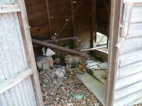 鉱山道路編'09。 何かの設備一式を取り出されてしまった廃作業小屋の裏手に回ろうとする自分・・・ 結構薮が煩く・・・(詰) 簡単そうに見えて、意外と苦戦しながら先を進むことになりました。 そして、側面にたどり着くと・・・ 何やら(画像のような)木造の倉庫みたいな建物がありました。 そして・・・(臭) 辺り一面に、水が腐ったような臭いが・・・(腐) 耐えられない事は無いのですが、気温が上がっていたのも加わって、結構「不快」な感じが!!(泣) このシチェエーション。 このサイズの建物。 そして、この腐敗臭 も、もしかして、廃トイレ?(滝汗) 一瞬・・・ ココに来てしまったことを心から悔やんだのは内緒ですが・・・(笑) と同時に、ヘンな好奇心が湧き上がり・・・(アホ) 見なきゃいいのに、小屋の中を覗きこんでしまい・・・(興) ん? あれ??(汗) 何? この小屋・・・ どうも水洗トイレという訳ではなさそうです! って言うか、何? このポンプみたいの?(謎) 浄化槽用のポンプとは違うみたいですし・・・ って、廃トイレという概念が頭から中々消えなかった自分は、状況を理解するのに少し時間が掛かってしまいましたが・・・(汗) どうもココは、水の循環施設のような感じ? すぐ脇には水槽みたいな物もありますし・・・ って、ココの水が腐っていて、あの嫌な匂いを発生させていたみたいです!(臭) 一瞬・・・ 間違って夏場に来なくて良かったと・・・(汗) 腐った水・・・ 激しい腐敗臭・・・ 間違いなく、薮蚊とかブヨが大量発生していそうな雰囲気ですしね!!(爆汗) って言うか、やはり足を踏み入れてはいけない場所だったような気が・・・ ちなみに、この建造物。 何となく何の為に建てられたのか分かってきました。 どうも、この水槽内の水をさせる設備。 「冷却水」として、この水を使っていた感じ? あの撤去されていた機械の冷却用?? そんな感じです。 その水の流れが止まってしまって(何十年経っているのかは不明)、水が腐っているんですね・・・ ま、何にせよ結構臭いので、あまり長居せず先に進みます。 つづく。