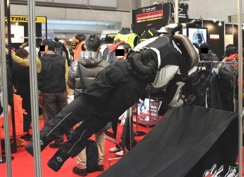 今から10年位前のことだったと思います。 その年の東京モーターサイクルショー会場の片隅に、発売前のエアーバックジャケットが展示されたのは・・・ ただ・・・ それから結構な月日が経ちますが・・・ いまだに、あまり普及していない様な気がするのですが(汗) 自分の周りでも買った人は居ませんし・・・ ツーリング中に、着用している人を見た記憶がありません! って言うか走っている最中は、線路とか索道とか隧道とかしか見ていないから・・・(汗) って言うか、ちゃんと前を見て走らないと危ないんですけど(困) と(汗) 話しがズレてしまいましたが・・・ 普及率の低さからなのか? それとも、生産量が増えてコスト的にも安くなったからなのか? 今回は過去最大規模での展示してきたHit-airブース。 ただし遠目で見ると、釣り用品のブースみたいに見えちゃうところが!(笑) 安全を考えると着用した方が良いのでしょうけど・・・ ま・・・ 通勤でバイクを使うようなら自分も買うかもしれませんが? 何となく、夏場は蒸れそうな気がして・・・ そして冬場は、着膨れして動き辛そうな気がして・・・ そして何より、まだデザイン的なものがイマイチで(涙) さらに、乗り降りの度にケーブルを着脱しないといけないのが!!(泣) 慌てていて、ケーブルを外さずにバイクから離れてしまい(滝汗) エアーバックが誤作動とかしたら(膨) ソレこそ、街中でライフジャケットを着ているようにしか見えなくなりそうで・・・ ま・・・ プロテクター類コテコテ装備のライディングジャケットで山の中を歩き回る自分が言える筋合いはありませんけどね!(笑)