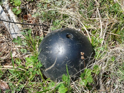 鉱山道路編'09。 さすがに索道施設跡に登る事は諦めた自分ですが・・・(悔) そのまま帰るのも、ちょっと悔しいものがあります! と言う事で・・・ 辺り一面に散らばっている残骸の中に、ネタになるものが無いか? つい、チェックを始めてしまい・・・ ただ、前にも書きましたが・・・ 5月だと言うのに、既に気温が30℃近くまで上がり・・・(暑) いい加減、辛いものが! って言うか、あまりに興奮しながら歩き回っていたので、すでに汗でパンツまでグチョリ状態になっていたり・・・(濡) ま、そんな事はさて置き・・・ 個人的には、レールとか (←また、それかいっ!) 索道関連以外のものが落ちていないか期待していたのですが・・・ 悔しいですが、特にコレと言った物を発見できませんでした(涙)。 ただ・・・ 何故か1つだけ・・・ 画像のバケットが! ホッパーに鉱石を投入するために使われたはずのバケット。 恐らく、10個以上がグルグルと回りながら使われていたはずなのに! そして一昨年。 同形式のもが撤去されて道路わきに置かれていたのを見た記憶があるのに。 何故に1個だけ残したのか?(疑) もしかして・・・ とりあえずココまで来た人達へのネタとしての供物として、わざと残したのか?(笑) ま、そんな事は無いでしょうけどね! そして、いい加減暑さで疲れて退却しようとした時・・・(踏) 足元に何かが落ちているのに気づきました!(何) 何故にボーリング玉???(爆汗) この鉱山にボーリング場があったなんて聞いたこと無いですし・・・(汗) それに、こんな場所で練習できるような平らな場所もありませんし・・・(狭) 従業員のマイボールだとしても、居住区でもないこんな所に何故??? まさか、このボーリング玉で斜面を砲撃した結果が崩落を招いたとか?(笑) 何とも不思議な光景が・・・(謎) ま・・・ 暑いので、あまり深く考えるのは止めて、道路まで戻る事にします。 まだまだ続く!(たぶん、あと1週間)