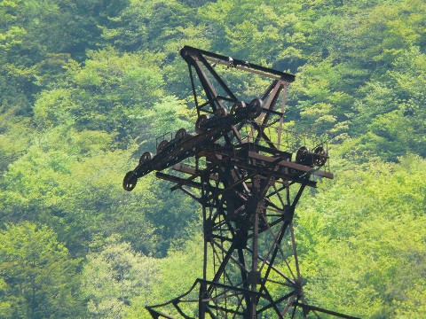またも無駄に引っ張りモード中の鉱山道路編'09。 正直なところを言うと・・・ 色々と今後のネタ(新企画を含む)が溜まってきているので、そろそろ終了させたいのですが・・・(困) と言う事で、ココから先は早足で? さて本題に戻り・・・・ 毎度お馴染みの精製所近くの索道鉄塔!! 今年も健在です!!(嬉) ワイヤーが撤去されてしまったのが非常に残念ですけどね!(涙) ま、コレを撤去しようとなると・・・(汗) かなり大掛かりな作業になりますからね! ここまで大型クレーンは入って来れませんし・・・ って言うか、20t級トレーラーは入って来れないはずですから。 現地で組み立てるにも・・・ かと言って、強引に倒してからバラすという手を使うにも無理がありますし!!(汗) 何しろ・・・ 鉱山事務所前の案内図に書かれていることが真実なら(汗)。 元々は、ここから両神山方面を越えて現在の国道299号線方面まで続いていた事になる、この索道!!(凄) 昭和前~中期のスペックで造られていたとすると・・・ 物凄く丈夫(現在なら完全なオーバースペック)なはずですから! そう簡単には壊れません!! おそらく当面の間、撤去されず、この地に残ってくれる事でしょう! ま、そんな事はさて置き・・・ 今まで何度も、この鉄塔の画像を撮っているのですが・・・ どうしても逆光条件になりやすいため(泣)、鉄塔が真っ黒に写ってしまう事が多かったんです!(涙) って言うか、単に自分の腕が悪いだけなんですけどね!(恥) でも今回は!! ちゃんと、鉄塔の原色に近い色が表現できました!!(嬉) 実際は、こんな感じのコゲ茶色なんです! しかも・・・ 滑車付近のディテールも、かなりハッキリと写っています!!(嬉) 30℃近い気温で、いい加減だるくて仕方なかった割りには・・・(汗) ま、その苦労に見合った画像が撮れたというか!! なお・・・ この滑車部分のデザイン。 個人的には結構好きです! 最新のものと違って、微妙にデザインされているのが!! そして・・・ 今年の正月2日。 銚子で、この廃車体(一応、静態保存されている事になっていますが)の台車を見たとき・・・ 思わず、この鉄塔の滑車を思い出しちゃいました!(笑) 当時の産業機械デザイン。 何となく似ているところがあるんでしょうね?