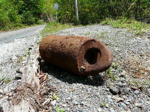 さらに鉱山道路を南下する自分・・・ すると・・・ 道路わきに、茶色い物体が落ちているのに気づき慌てて停まりました! 真っ赤に錆付いたガスボンベ? って言うか、まるで不発弾みたいな格好・・・(汗) もしかして、北の将軍様が打ち上げたロケットらしい物の残骸?(落) んな訳はありませんが!!(笑) だって、ここは東北じゃありませんからね! 秩父の山奥ですし。 とりあえず、その茶色い物体に駆け寄る自分。 いい加減暑いので、こんな物は無視したい気分なのもありますが・・・ イチイチ、ヘルメットを脱ぐのも面倒なくらいなんですけど・・・(涙) 次ぎにヘルメットを買うときは、絶対にシステムタイプ(前側半分が開くヤツ)にしようと、この時に思わず考えちゃいましたし・・・ そんな状態でも「とりあえずネタになりそうだから」と! で・・・ 結局、何が落ちていたのかと言えば・・・ 単なるウェイト。 ワイヤーなんかの張りを調整するための錘です! 一体何で、こんな所に落ちてるのか? 撤去した索道施設の残骸を運ぶ途中に、トラックの荷台から落ちたのか? いくらなんでも、不法投棄には思えませんしね! 色々と謎は残りますが・・・ 暑いので、あまり細かい事を考えるのはヤメにして・・・(棄) 再びヘルメットを被って、走り出そうとした時!!(ロックオン) 何かの気配を感じたんです!! さ!? その気配の正体とは!?(迫) 明日に続く!