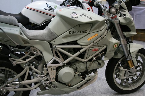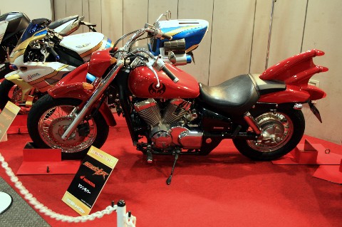 さて・・・ 出版社ブースや、その他の用品メーカーブースに展示されているカスタム車は・・・ ん??? どこかで見たようなカラーリングですけど・・・(汗) ま・・・ あまり深く考えるのはやめましょうね! とは言え・・・ 下手にコテコテと高価なパーツをつけたり。 「お金が掛かってます!」と言わんばかりのカスタムよりも、個人的にはこちらの方が好きです! ただ・・・ そう安々とbimotaを買うような真似は出来ませんけど!(笑) でも・・・ エキパイやエンジンまで塗っちゃったと言う事は(汗) 単なる飾り? って言うか、走らせるつもりは無いということ? ソレはソレで寂しいところがありますけどね! なお個人的には・・・ ノーマルの形を活かしたカスタムの方が好きなんですよね。 たとえ、こんなに派手にされちゃっても! 本家カスタムコーナーよりも面白い、会場内のカスタム車の話題でした・・・(汗)