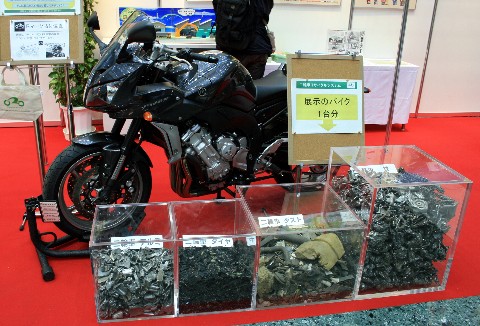 しぶとく続いている東京モーターサイクルショー2009編。 とりあえず、明日まで続きます。 4輪の方は、買う時にリサイクル料金と言う物を取られますが・・・ って言うか、それを払っていないと車検も受けれませんし下取りもしてくれません(汗)。 よくよく考えたら、バイクの方は払った記憶がありませんし、車検証入れの中に証紙も入っていません! さて、その話は別として・・・ 「バイク1台分からどれくらいのゴミが出るか」と言った内容の展示がされていました。 バッテリーやオイル類を除いた状態のものですけど・・・ 左から「アルミくず」 「タイヤ」 「樹脂部品」 「金属部品」の順に並んでいますが・・・ なお・・・ この量に関しては車種によって異なってきますから、一概には言えませんけどね! ただ・・・ 意外とタイヤの占める割合って大きいんですね?(驚) 重量的には大したことは無いのかもしれませんが!! あと・・・ ビクスクだと、アルミが殆ど無く・・・ また、金属部品も少なくなり・・・ 樹脂部品ばかりになって「如何に安く造られているか?」 そして、メーカーの利益がどれだけ大きいかが良く分かるんですけどね!(笑) なぜに各メーカーがビクスクに力を入れるかが良く判るのですが・・・ さすがに今回は、その展示はありませんでしたけどね! って言うか・・・ これだけリサイクルできる金属部品があるんだからと言う事を伝えたかったみたいですし・・・ そして皆さん! 乗らなくなったバイクの不法投棄はやめましょうね! また、リサイクル出来る部品も沢山あるのですから!!
