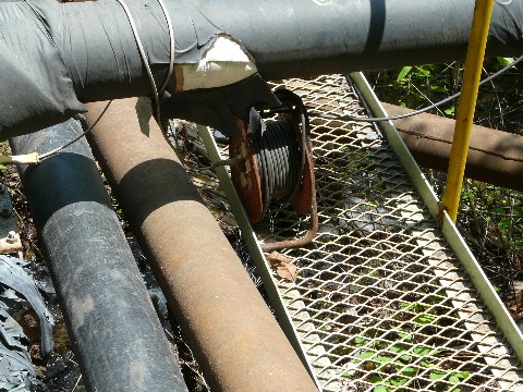 鉱山の事務所から、雁掛トンネルまでの短い区間。 道路沿いには導水パイプが通っています。 トンネルの向こうにあるシックナー(濾過装置)に水を送るためのものなのでしょうけど・・・ そして、この導水パイプの脇に・・・ 3年位前から、ずっと気になっていたのですが・・・(汗) ずっと同じ位置に・・・ って言うか、放置されっぱなしのコードリールがあるんです!! どう見ても、その辺のホームセンターで売っていそうな・・・(汗) 特に防水仕様になっている気配もなく・・・ って言うか、野外で放置しっぱなしにしてて大丈夫なのか?(汗) この手のコードリール!? 台風のときなんて、ずぶ濡れになっていたはず!! ま、それ以前に「電気が通っているのか?」が疑問なところもありますが・・・ この手の細かい謎も多い鉱山道路。 って、こんな事ばかり書いているから、全然終われなくなるんです・・・ まだ続くんです!!(泣)