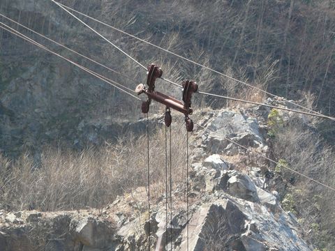 廃電柱の立っている場所から見あげてみると! そこには、あの索道が架かっている廃鉱の斜面が!! ちなみにコレの事ですからね!(微笑) って言うか「まだ終わってなかったのか?」の索道ネタ!(笑) いや、だって・・・ 普段は周りの木の葉が視界を遮っていて、気が付かなかったんですけど! 今回は、あまりに見通しが良いものだから、つい「その存在」に気付いちゃったんですもん!!(訴) って言うか・・・ あの崖の上辺りに、索道の終点があるはず! って言うか、ワイヤーが架かっている場所が! 場合によっては索道を操作する場所があるかもしれない!!(熱) と言う事で・・・ 大体の位置を予想しながら・・・ って言うか、あの山の地形なら、大体のことは頭に記憶しちゃいましたからね!(困) って言うか、無駄にスペック高いぞ自分の頭!(爆) 無駄に5年間も通っていないですからね! って言うか、このブログの歴史と同じかよ!(驚) そして念のために言っておきますが、ココは鉱山ブログではありません!! ダム・ブログですから! じゃなくて、一応はバイク関連のブログなんですけど・・・(困) そんな事はさておき! 大体予想した位置の画像を、最大望遠で何枚も撮る自分。 視力がイマイチのため、はっきりと目標物をロックオンできませんが! いや、それでもたまに見えちゃうことがあるんですけど! 魂の目で とか言う冗談はさておき・・・ ま・・・ 相手が、あまりに「か細いワイヤー」ですからね! さすがに肉眼でロックオンすることは出来ません! かと言って、デジカメの液晶画面で確認しながら撮るのも不可能に近い! って言うか、最大望遠で液晶を眺めていると酔うので・・・(吐) ま、とにかくです! 自己狙いで画像を撮ります! そして家に帰ってから画像解析をすれば良いだけのこと! そして来年。 また来るときの課題として使えば良い訳ですし・・・ で! 圧縮の関係で見えづらくなっていますが・・・(涙) しっかりとワイヤーが写っています! しかも、作動させるための滑車までもが!!(嬉) ただ一つ分かったことは・・・ この岩盤の上には、アンカーとフックでワイヤーを固定しているだけと言う事(悔)。 索道の操作装置は、この上に無いという事! 知ってしまって、がったりする事もありますが・・・ これで一つ。 長年の疑問が解けました! さ・・・ 次は、どのようにして索道装置を探すか? 新たな課題に楽しみが、こうやって増えていくんです・・・ つづく。