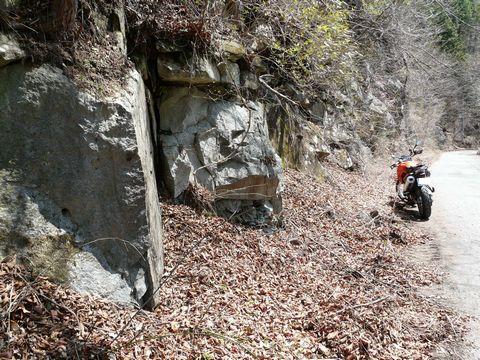 さて今回は・・・ 実のことを言うと八丁峠から先は、ずっと・・・ エンジンを止めたまま、下り坂を惰性で降りてきているんです!(転) しかも今までと違って、アップライトなライディングポジションのG650GSは! いやぁ・・・ コレは別の意味で、自分にとって危険なバイクですよ(困) だって今までだって、前傾姿勢をしながら・・・ 普通に走りながら色んなものを見つけてしまうのに! って言うか危ないですから、皆さんはちゃんと前を見て走りましょうね!(願) 絶対に脇見運転はダメですよ! 特に、この手の山岳道路は! ですが! 今まで以上に視界が良くなってしまったF650GS。 しかも惰性運転なんて、ゆっくりとしたペースで走っていたら! さらに余計のモノを自分の目がロックオンしちゃうんですよ!(困) 特に今回は、周りに草木が茂っていないだけに色んなものが見えますから! しかもです! 特に今回は・・・ 上の画像の場所。 まるで誰かが石を切り出して造ったかのような斜面。 一瞬、廃坑があるのかと期待しちゃいそうなシチュエーション(笑)。 このまるで鋸で切ったかのようにキレイな断面を見せる岩肌。 いやいや、実は、そんな物を見つけたからと言って「わざわざ停まって画像を撮った」のではありません! 実は、このすぐ脇にある穴? 直径4cm程の穴。 これを走っている最中に見つけ!(呆) って言うかさぁ・・・ 本当にいつか、事故を起こさないように気をつけないとね!(困) 自分。 一体何処を見ながら走っているのか? たまに自分でも心配になる時があるんですけど!! とにかくです! まるで水抜き穴? それとも、何かしらのアンカーを打ち込むために開けた穴? まさかと思うけど、自然に出来た穴??(謎) こんな物を走行中に見つけて、ふと気になってしまい・・・ つい索道でも近くにあったのではないかと言う考えが頭を横切り・・・ って言うか色々と疑い始めると、どんどん深みに嵌ってしまうのが鉱山道路の困ったところなんです・・・ はぁ・・・ まだ全体の1/4も終わってないや!(困) とにかくです! 当分続く!!