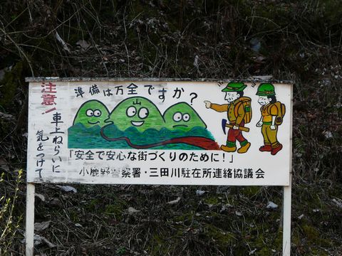 さて、ココからが真のスタートとなる八丁峠。 思い起こせば、ココでは色んな目に遭遇しました(懐)。 深い霧に巻かれたり・・・(白) 立って歩くのすら困難なくらい、思いっきり凍結していたり・・・(滑) そしてココは、両神山登山の出発地の一つだったりします! 一度は登ってみたいんですけどね! 何しろ、ココまで車で来るのが面倒なので!(困) パイクで来るのは何とも思わないのですが・・・ かといって、登山装備を持ってくるわけには行きませんからね! それに・・・ やはり登るなら縦走が良いですから! スタート地点とゴールが違うほうが良いですから! なんて事はさて置き・・・ この注意書きの看板。 微妙にツッコミどころが!(笑) この赤い川。 一体何??(怖) そして! 「安全で安心な街づくりのために」とか「車上ねらいに気をつけて」とか・・・ 色々と書いてしまったため、本来の趣旨が分からなくなってしまっています!(困) 登山客用に注意を呼びかける看板なのか? それとも、スローガンの看板なのか? 何でも詰め込んで書けばよいというわけではないのに・・・ ま、そんな事はさて置き。 この八丁峠。 このルートを開墾するのには・・・ なんと23年の年月を要したそうです! そのおかげで、こうして毎年のように。 この時期に探索に出かけられるのですんです!! そして、このトンネルのおかげで・・・ 縦走しながらの探索が出来るんです! 行って、戻ってのルートだったら・・・ 自分。 ココまで毎年のように来ることはなかったかもしれません。 さ! 特に今年は、後半戦の話題が長くなるので・・・(困) あまり引っ張らずに話を進めます!! つづく。