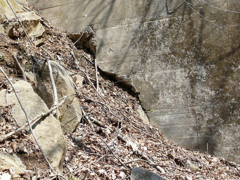 2010春の二瀬ダム編。 昨晩と同じ画像でスタートしますが・・・(汗) 画像の矢印付近。 その時点では「穴」があるかもしれない場所として記憶していた部分。 仮設橋のおかげで見えなくなってしまっていた問題の場所。 ついに、そのベールが剥がされるときが! って、夢中になってて完全にカモシカの事忘れてたし!(困) とは言え液晶画面では細かいディテールが分からないので、付近の画像を最大望遠で何枚も撮り! 事故でモノが写っていることを祈りつつ!! って言うか、こんな事しているからデジカメのカウンターが物凄いスピードで増えて行っちゃうんだよなぁ・・・ 買って2年。 すでにカウンターは21,000を超えました! おかげで、既に動作が鈍くなってきています(涙) ま、そんな事はさておき・・・ おおっ! 確かに穴っぽいぞ!(喜) ダム建設時に、恐らくこの岩盤を原石山として削って使ったはずですからね! その時の坑道なのか? それとも、この地下でダム建設に使う石灰石を採掘していて、ココからズリ石を捨てていたのか? 大きさと位置からして、ここから出入りしていたとは考えづらいモノがありますからね! って、画像の一部を切り取り拡大!! おおっ! 何か鉄筋っぽいモノが2本生えてる!!(萌) って言うかコレは!(涎) たぶん、ココに吊橋が架かっていたのではないかと!? あるいは、索道か何かの受渡し口が? 木橋(または鉄橋)&線路だったら萌え萌えの状態なんですけど!!(悶) ただ、角度がイマイチで!(悔) はっきりとした姿が分かりません!(涙) くううっ! これは仮設橋が完成して・・・ 管理事務所の移設が終わって・・・ 橋が一般開放されるのを待ってからでないと、正確な答えが出せそうに無いです!(悔涙) なお、おまけ画像ですが・・・ この穴の上方。 ダム建設時に使われた索道用の鉄塔基礎部分? この位置から見ると、結構いい感じです・・・ しぶとく続く!!