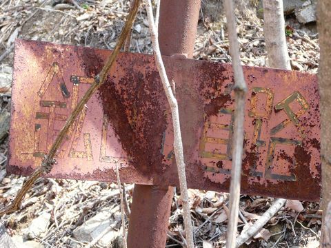 鉱山道路編2010。 って言うか、また出やがった!? 崖の上に攀じ登ったら・・・ どうも、廃火薬庫らしき建物を見つけてしまった自分!(焦) さらに、その背後。 数メーター上の崖の上。 そこに何やら別の建物の気配を感じ・・・ またも崖を攀じ登った自分。 が・・・ そこに待ち受けていたのは!!(叫) 念のために言っておきます。 本当に危ないですから、良い子は絶対に真似しちゃダメですよ!!(願) とりによって、また火薬庫っぽいヤツかよ!!(泣) 今回は柵とか消火器は装備されていないけど! この密閉構造。 そして、頑丈に閉じられている扉。 本当に嫌な予感がします! 絶対に爆発はしないけど! って言うか絶対に中身は入っていないけど!(と思う) 万が一の事があれば、自分は・・・ この小屋と共に、この世から消滅!?(泣) ただし今回は、すぐ前の木に何かの看板が付いています! もしかしたらココに、この小屋の正体が書かれているかもしれません!!(輝) が・・・ 字ぃ、消えかけてるし! って言うか、白く上から塗りつぶされたような跡が!!(泣) とりあえず目を凝らして書かれていた文字を判読してみると・・・ ←工事区間→ ってオイオイ! 木の天辺から根元にかけて何の工事をしようと言うんだ!!(謎) まさか発破で、この辺り一帯を丸ごと消し去る気か!?(叫) って言うか、さらに謎を深めるばかりで・・・(困) ま・・・ あまり長居したくないので、ここで引き下がりますが・・・ この崖の上にあった2つの建物は一体何だったのでしょう?? そういう疑問を持ちつつ、先に進むことにします。 そのうち・・・ この建物に関して調査した人の記事を見つけることが出来るしれませんし?