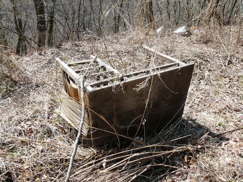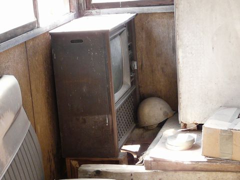 廃作業小屋の中に残る、実に昭和チックなテレビ。 って言うか・・・ まんま昭和40~50年前代の物でしょう? たぶん?? まだテレビが高価で! 三種の神器とか言われていた時代のもの?(テレビ・冷蔵庫・洗濯機) 今みたいに機能重視な物ではなく・・・ 「資産」としてみなしても良い位、所有価値が高かった時代のものですからね! 見栄え重視!(凄) 本体は「木目調」ではなくて、本当の木! しかも合板ではなくて、かなり上質のもの1一枚板を使っている可能性もあります! だが、しかし! どんなに細工しても地デジは絶対に映りません!(笑) さらに、小屋の外に落ちてる「お約束のビデオっぽい物」も観る事が出来ません! だってビデオ端子が付いていませんから! ヤマの男の人達。 悶々としたモノが詰まった箱を目の前に・・・ このテレビを恨めしそうに眺めていたのかもしれません!(笑) ま・・・ そんな事はさておき、このテレビ。 単に倉庫代わりとして、この廃作業小屋を使っていた時代に押し込められただけの物なのか? それとも現役時代には、ちゃんとこの場所で観る事が出来たのか?? ちょっと疑問だったりして?(笑) 確かに鉱山住宅があった数キロ先では集合アンテナが存在していたようですが・・・ こんな山奥まで電波が届いていたのか? そして、某国営放送は集金に来たのか??(笑) ふと、コレを書いている途中で疑問に思ったりして??? って言うか、このブログ。 画像に対してアドリブで文章を付けている事が多いので!(困)。 文章が支離滅裂。 おかけで、前後の繋がりが全く無かったりしちゃうんですけどね!(困) とか言う内情は、さて置き・・・ この廃作業小屋。 天井が、段々と重力に負けかけてきています!(落) おそらく、そう遠くない時期に内部が崩壊しそうな気が!!(壊) あと何年。 この姿を見ることが出来るのでしょう??