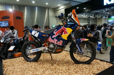 東京モーターサイクルショー2014編 さて・・・ 基本的に、大阪モーターサイクルショーに来てくれないメーカー等の話題で進めていく、このコーナーですが! 今回だけは? KTMだけは再び登場です・・・ と言うのも! 東京モーターサイクルショーには、今年のパリダカ優勝マシンを持ってきたから! 去年は、ホンダさんがパリダカ用ワークスマシンを持ってきてくれましたが・・・ 今年は! 4台体制で臨んだにも関わらず(涙) 無念の結果と終ったためか? それとも・・・ どう見ても、完全なプロトタイプマシンではなく(困) 市販CRF450をベースに、HRCのキットパーツと専用外装を組んだだけのバイクだと・・・ 遠目で見ても判るのに、晒し者にしたらもっと悲しい現実が見えちゃいそうだから? だから展示をしてこなかったのか?? そのせいで? パリダカ用のワークスマシンを持ってきたのはKTMだけになってしまいました(涙) と言う事で? 再登場?? 基本的に市販車のスペシャルチューンですが? 元々から、公道を走れる市販エンデューロマシンみたいな所がありましたしね! なんて思っていたら!(驚) 今年は限定生産で!(凄) コレに近いスペックの市販レーサーを発売するらしいですから! 恐らく? 小改造だけで、ラリーに出れるぞ? もしかしたら? ただし! 排ガス規制や騒音規制の関係で・・・(悔) 日本では、公道走行は認可が下りないのではないかと? そう囁かれていたりしますけど・・・(涙) 基本的にレース中はGPSの使用が禁止されていますから! コマ図と・・・ コンパス(方位磁針)と・・・ 距離計だけで、走ります! 更に無線も使えませんし・・・ 4輪の様に、ナビゲーターの人も乗りません! 全て一人で半月近くの長丁場を戦う事になるんですよね! 色々な補佐をする電子機器と・・・ 操作スイッチ! それが、コンパクトにまとめられています! しかも軽量化のために、アルミやチタンが大量に使われていたりして! さらに! 燃料タンクも軽量化のために樹脂製で・・・ ガソリンのの残量が一発で判るように? 半透明になっている! 一部、塗装されていないところがあって・・・ ソコに目盛が付いてて! あと、どれくらい走れるか計算できるようになっている! って言うか、良いよね?(涎) 専用のバイクって・・・ そして! 限定とは言わず! コストダウン型のレプリカも発売してほしいよね?? でも、現物を見ちゃうと!(焦) あまりの差に! って言うか、現実の壁の大きさを知って幻滅することになるんですけどね・・・にほんブログ村