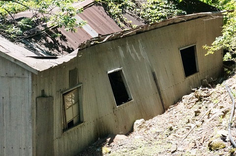もう、この看板の文字も殆ど読めない・・・(涙) 背後の石垣も、誰も手入れしていないから・・・ 雑草が隙間から好き勝手に生えてきています!!(困) 特に! この手の練石積みと呼ばれる? この石垣。 このままだと、草や木根のによって破壊される日が来る?? そして! そんな石垣の上には! 丹袖寮と呼ばれた社員寮が! 一応・・・ 一番最後まで使われていたらしい? と言っても、管理人していた人が山を下りてから、もう5年以上・・・ 周りの木に飲み込まれかけています! 自然の植物の生長の早さって・・・ 意外とすごい物なんですね!!(驚) でも? もしかしたら?? この木があったおかげで? 雪に耐え残ったもかもしれない? 古木だと、雪の重さで倒れて(困) 建物にトドメを刺しに来るかもしれませんが?? まだ成長真っ盛りの木だったから? 雪の重みを分散させた? って言うか、直接屋根に乗る雪の量を減らしてくれた?? 木が被さっていない建物は(焦) 何となくヤバげな屋根の割れ方をしていますが!!(焦) もしかしたら?? これが自然との共存? な、訳ないですね?(焦) にしても!! ココにあった町全体が森に飲み込まれるのは時間の問題ですね? もし、全てが雪で倒壊していたら!(泣) 来年の夏は、本当に「森」になっていたかもしれません? で・・・ この森の中がどうなっているのか? また木の葉が落ちる季節にならないと分からない事だらけのような気が? でも・・・ このまま事実を知らない方が幸せなのかも??にほんブログ村