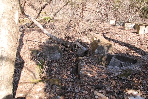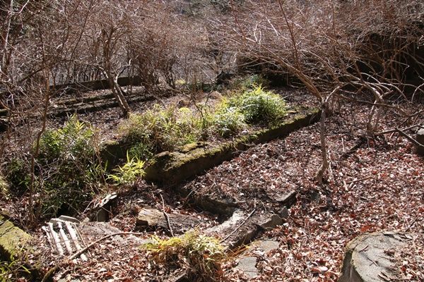 ちょっと蹴躓いたりして、左側に倒れると・・・ 速攻で石垣から落下できます!(痛) って言うか、たぶん 無事では済みません(泣) 結構怖いです ココ・・・ だから、もう一度言いますが! 良い子は絶対に真似しちゃダメだぞ!!(叫) と言う前置きをしておいて・・・ たぶん? 発電機用エンジンの冷却水を排出 一時的に溜めておくための水槽を兼ねた?? 堀 なのかと? 周りの木の枝が落ちてくれたおかげで やっと、この近辺にも入れるようになりましたが・・・ そう。 この落ち葉の下に何が隠れているか分かりません ので・・・ 転べば崖下に直行です!(怖) この堀の中に入るか? かなり悩みましたが・・・(焦) 思ったよりも深くて 入ると、上がって来るのが大変そうなので・・・ 我慢すことにしました(悔) で・・・ 排水管? 周りのコンクリートを砕いて! そして、溶断された跡があるので・・・ 先端に、エルボーか何か? または、延長用の配管が繋がっていた可能性が?可能性がありますが・・・ この堀! 西久保受発電所が現役で稼働していた時代に、上空から撮られた写真を見ても 写っていないんですよね・・・(焦) 単に画質が悪くて、識別できないだけなのかもしれませんが? だから(悔) この辺りの構造がどうなっていたのか? 全く分らないのですが・・・ でも! この堀の側壁に 四角い柱を差し込んでいたような形跡が 多数残ってる! って事は・・・ 木の角材かせ何かを突っ込んでおいて その上に蓋をしていた可能性がある だから、写真には 堀が無いように写っている可能性が! にしても・・・ この狭い所を進むの 結構怖いんですけど!(泣) 本当・・・ 周りの枝が無くなってくれてて助かったよ! 今まで 絶対に入ろうとは思わなかった場所だし(悔) 石垣の下に落ちるのは絶対に嫌だけど(痛) この堀の中に落ちるのも、後々結構面倒くさそうで嫌だし!! とりあえず 目の前にあった、細い木の塊をクリアします! すると・・・ 少しだけ幅が広くなって(その分、堀が狭くなる) で・・・(焦) 周囲に大量のスレート板が落ちてるけど ま、まさかね? 建屋を解体した後、このスレート板で堀を覆っていたとか言わないよね? 単に破砕くずだよね? なお! この部分まで来ると・・・ 堀の幅が狭くなり 勢いをつけて跨いで渡れるくらいになります。 でも、戻って来る時・・・ 勢いあまって崖下に落ちるかもしれないから(ガタブル) 気を付けないとね!!(泣) う~ん・・・ ココを渡るべきなのか? それとも 我慢しておくべきなのか? と悩んでいたら!! なんかある! そう 建屋の中に、四角く・・・ コンクリートで仕切られたスペースがある! ちょうど内側からだと、木が邪魔して近づけない位置だし!(困) こ、コレは・・・ トイヤッ!(跳) 水槽か? それとも、ココに水道の流しでもあったのか?? でも、配管が通っていないから 洗い場として使っていた訳ではなさそうだな? かと言って、柱を立てるにも 穴が大きすぎるし にしても・・・ 色々と資料を探しているんですけどね 西久保受発電所に関しては、発電機の事と制御システムの事くらいしか資料が出て来ないんですよね・・・ 建屋の中の写真も数枚が公開されていますが・・・ はやり戦後に増強された4基のエンジンと 制御盤くらいしか写っていなくて(涙) まあ、戦前から3回程度 発電容量を上げているらしいので その度に改築されている可能性もあるので? 保存されている資料が乏しいのかもしれません? せっかく渡って来たのに これと言った物が無かったのが(涙) ちょっと残念・・・ そして そして堀の端部は 木が邪魔で、これ以上は進めない為 でも、結構・・・ 横桟(木の角棒だと思う)を渡していた跡が 沢山・・・ でも、この位置からすると 蓋は、堀の表面にあったのではなく 少し低い位置にあった可能性がある? あるいは!! 何か他の装置でも入れてあったのか? にしても! あまりにマイナーな存在すぎて 冗談抜きに資料が少なすぎだぞ!(涙) って言うか、同業者さぁ~ん! 誰かいませんか?? ぐーぐるさんで検索しても・・・ ココの画像 自分がアップした物しか出て来ないんですけど!!(涙) って言うか、久しぶりだぞ このパターン!! しかも・・・ こんな堀の部分とか ピンポイントでチェックしている人 絶対にいないだろうな?(涙) 小河内ダムが竣工から60年を超えているという時点で・・・ 当時、ココで働いていた人がご存命している可能性も 相当低いしね(涙) あと余談ですが 数日前の動画に出て来た「ダムが憎い」と作文を詠んだ 小学生 残念ながら、既に他界されているそうで(涙) そしてココは! ウェザーニュー☆が登場する前は「一体どこの天気予報を見ればいいのか分からなかった」東京都ですにほんブログ村
