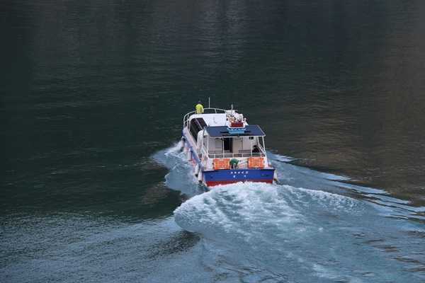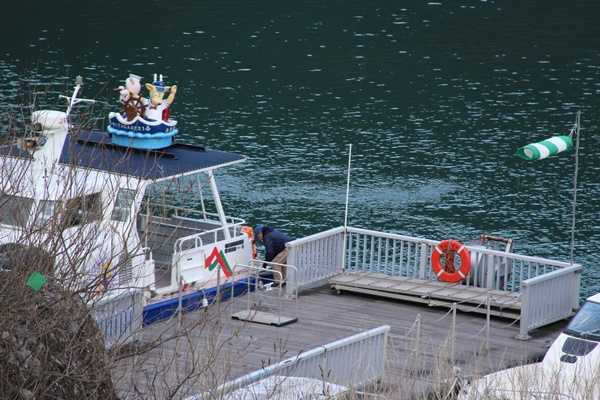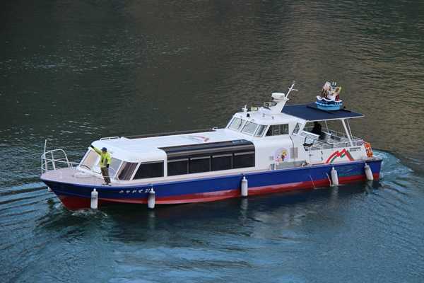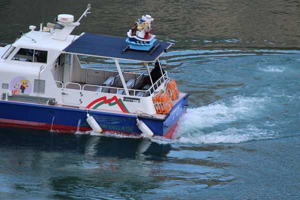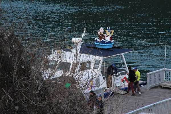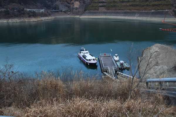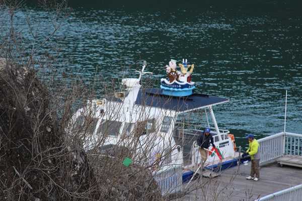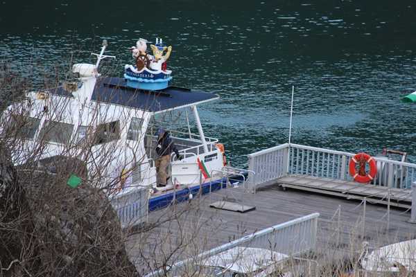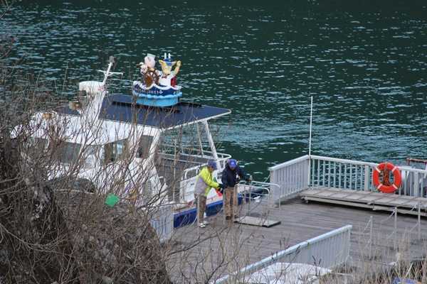 今度は、ダムサイトの浮桟橋からの乗船客が船に!
