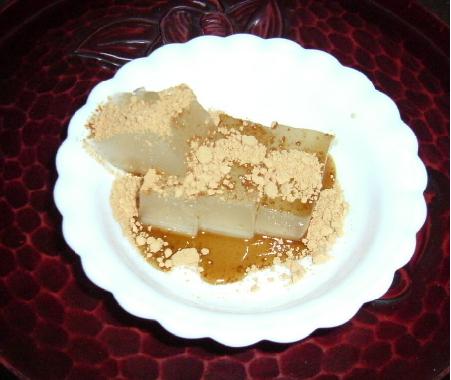 義姉さんが奈良のお寺参りに行きました。奈良と言えば吉野、吉野といえば、葛。葛といえば、吉野の葛餅。 冷たく冷やし、黒蜜にきな粉をかけていただきました。ゼリーとちがって弾力があります。う~ん。うまい。葛の花、きれいですね。ひと夏で10mも伸びるとか。あやかりたいものですなぁ。へぇ~、知りませんでした。根から葛根湯が採れるのですね。それに、葛という名前も、大和の国を「国栖(くず)」と言ったところから来たとか。万葉集にも登場。秋の七草のひとつなんですね。夏のイメージがありましたわ。
