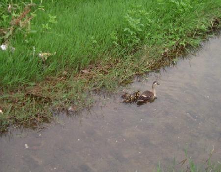あら、かるがもちゃん♪ 親子でお散歩ね。 すっかり忘れていました。4月頃かものカップルを川で見かけたのでした。なんとまあ、赤ちゃんが生まれていたのね。かわい~~~~♪右へすいすい~~~~♪ 左へすいすい~~~~♪ おっと。ちょっと列が乱れたぞ。またまた右へすいすい~~~~♪ おお、一羽遅れた子がいます。おかあさんの速い回転についていけなかったのね。よしよし。また列がそろってきました。 いいぞ、その調子。今度カナダのカルガモリーで行われる世界カルガモシンクロ選手権に出るんだったわね。でも、川の浅いところでは、おかあさん、あんよが川底についてしまうのよね。まるで歩いているみたいです。 本番の深いプールでおぼれないように気をつけてね。