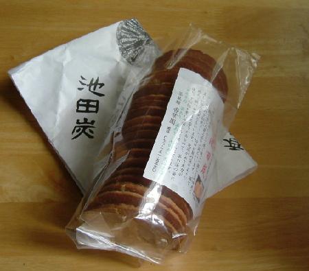 何を隠そう、わたくし、高校のとき茶道部だったのです。足がしびれてひっく・・・いや、茶の湯に親しみ、お菓子をぱく・・・いや、わび・さびの心を学ぶ、おしとやかな少女時代をすごしました。それにしても、長時間の正坐は大変でございました。八頭身というのは今も変わらないのでございますが、足が短くなったのはきっとこの正坐のせいかと・・・。最近知ったのですが、茶の湯でよく使われる炭に、池田炭というのがあるそうです。大阪の北のほう、能勢で作られているものです。切り口が菊の御紋のようになっているのが有名だそうで。こちらは池田炭のおせんべいでございます。 箕面の親戚のおばちゃんからいただいたものですが、まあ、なんですね、池田炭でたてたお茶をすすりながら、池田炭のおせんべいをほおばるのもまた乙なもんで。