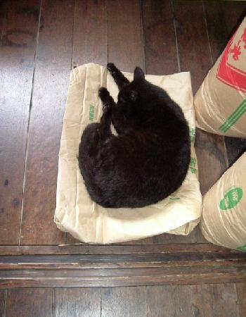 今日のちびにゃんこさん。 お米の袋の上で朝寝でした。茶比家では、豆腐屋さんを通じて近くのお百姓さんから毎年お米を1年分買います。30kg入りの袋で5~10ほど。食べるたびに精米しに行きます。ちょうど最近ひと袋食べ終わったのでたたんで置いておきました。片付けようと思って取りに行くと、ちびさん、ちゃっかりねんねしてました。気持ちいいんかなあ。ちょうど窓から日が当たるところなので、それがあたたかくて気持ちいいのね、きっと。いや、でも、今日は蒸し暑いぞ。暑くないんかい?